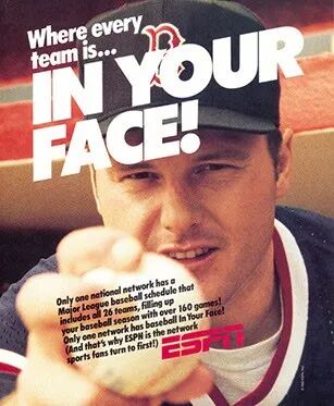 在他 1990 年为 ESPN 做的广告中,他通过说服不情愿的管理人员开展“在你面前”的广告活动来展示他的“大创意”(这不是第一次)。当时,ESPN 被称为二流体育有线网络。尽管遭到反对,Lois 还是设法说服了他们,他可以让 15 位当时最炙手可热的体育明星出现在他们的广告中……而且是免费的!他知道,这种上电视、身价百万的诱惑,会让大多数运动员垂涎三尺!