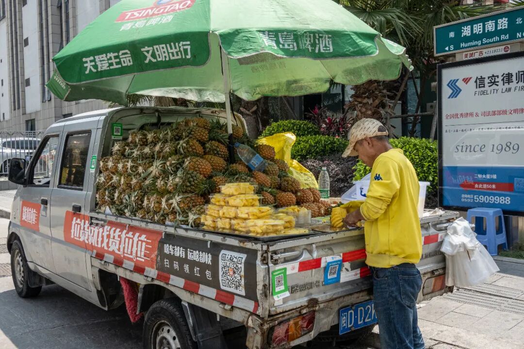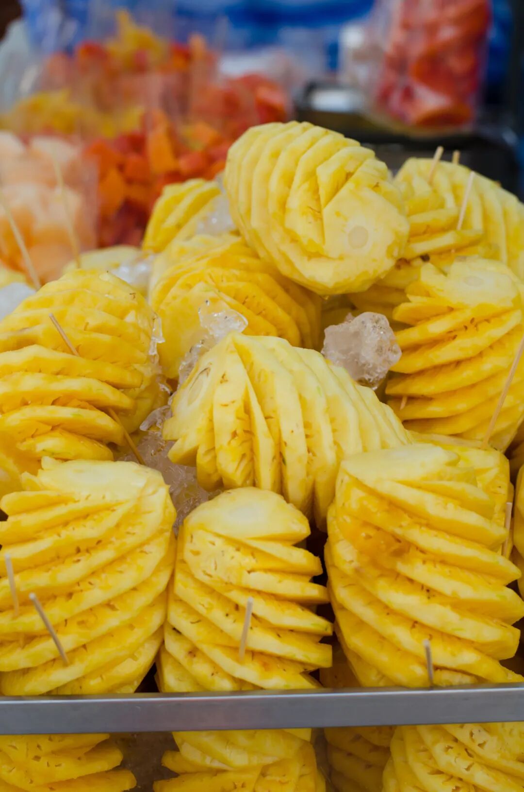 凤梨的果实淡黄,味甘酸,津沥芳香,是记忆里凤梨特有的味道。大叔麻溜地切成长条状后用竹签穿起,整齐地插在泡沫板上,等待嘴馋的小孩来花掉自己的零花钱。