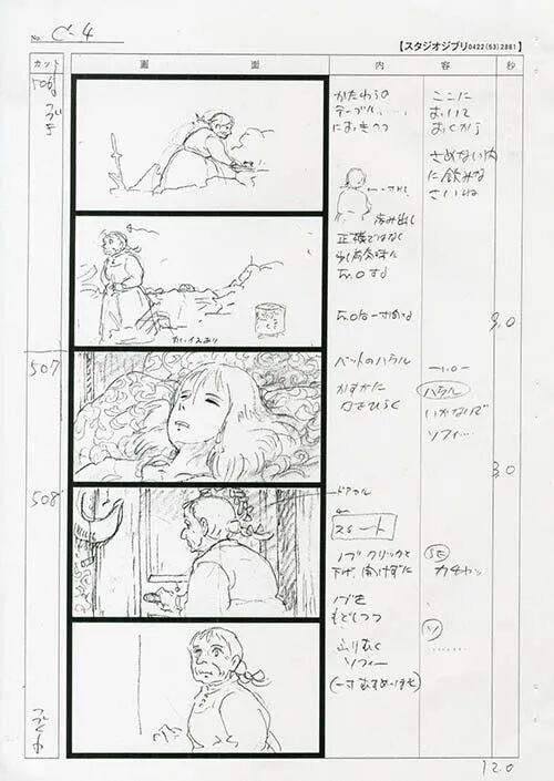 宫崎骏的分镜手稿依然是充满治愈感的画面,通过天马行空的构图形式,将整个故事娓娓道来。