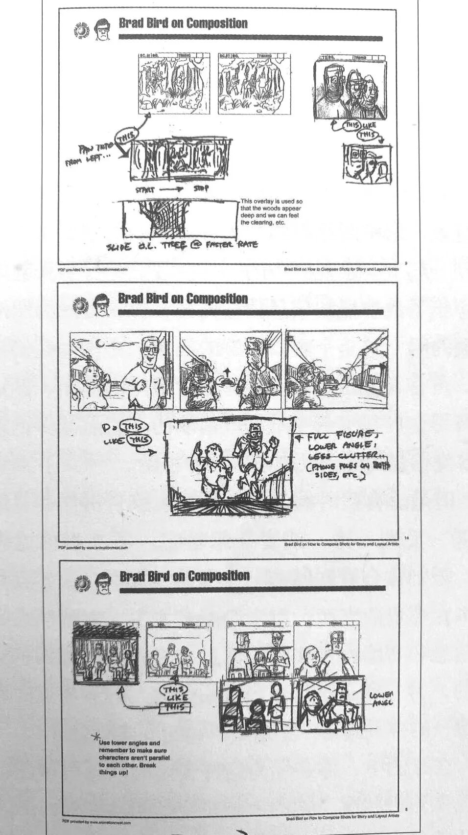 这是布莱德·伯德为分镜稿构图作修改的手稿。对比修改前后画面,可谓天壤之别,镜头画面构图重要性可见一般。