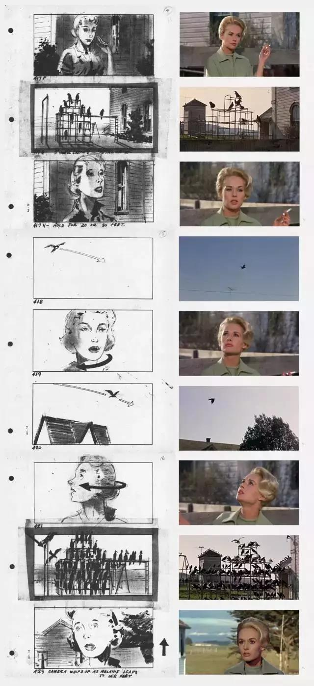传说,希区柯克在没有绘画分镜故事板的情况下,绝对不会开始工作。而确认好分镜故事板后,拍摄时可以看出,希区柯克完全还原分镜画面。