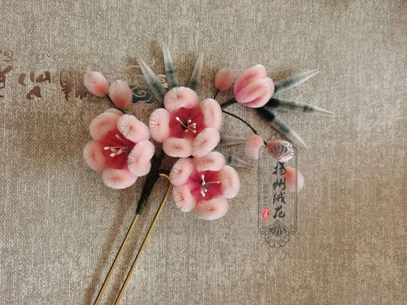 扬州绒花 粉色梅花灰蓝松叶渐变色系传承人制作省级非遗