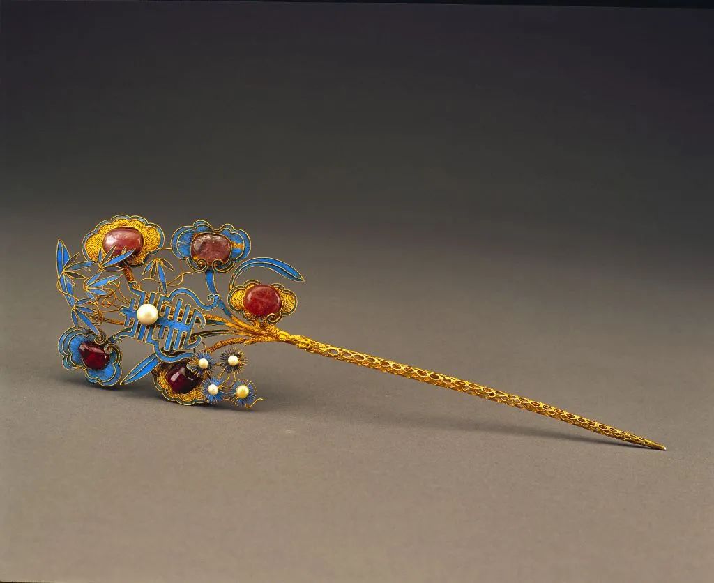 金镶珠石点翠簪,清,长24厘米,最宽7.5厘米,故宫博物院藏