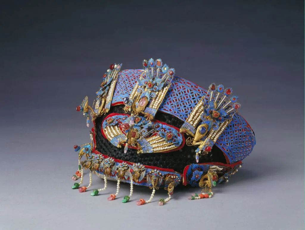 此为光绪帝皇后穿吉服时所戴。钿子用藤片做骨架,以青色丝线缠绕编结成网状。钿上部圈以点翠镂空古钱纹头面,下衬红色丝绒。