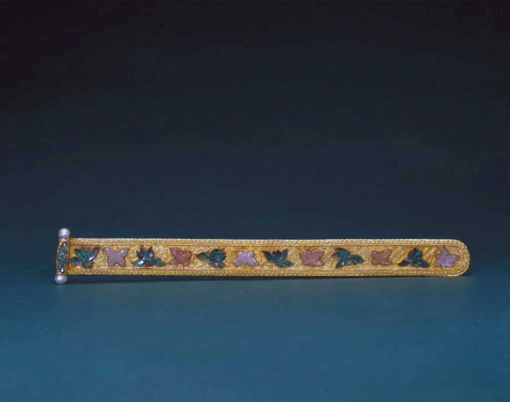 金錾花镶碧玺翠珠扁方,长31.1厘米,宽4.2厘米,厚0.4厘米,故宫博物院藏