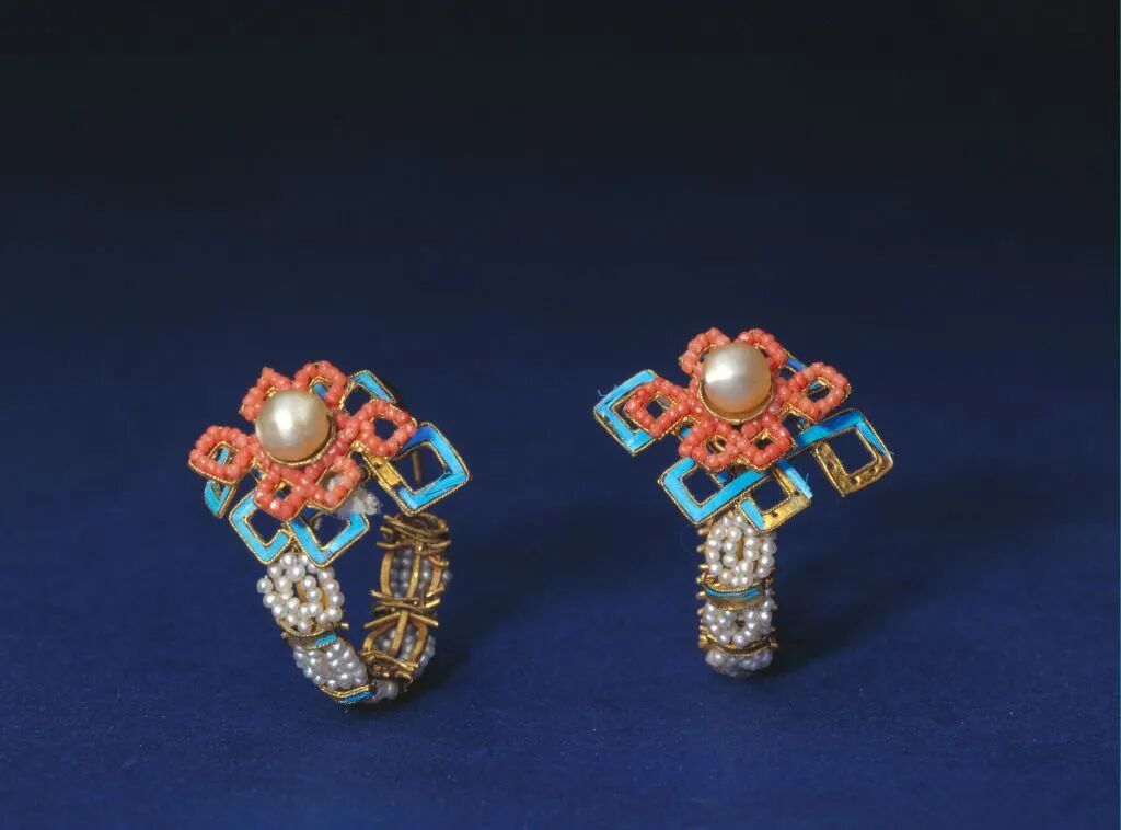 金嵌珠宝点翠盘长式耳环,清,一对,高2.6厘米,宽2厘米,故宫博物院藏