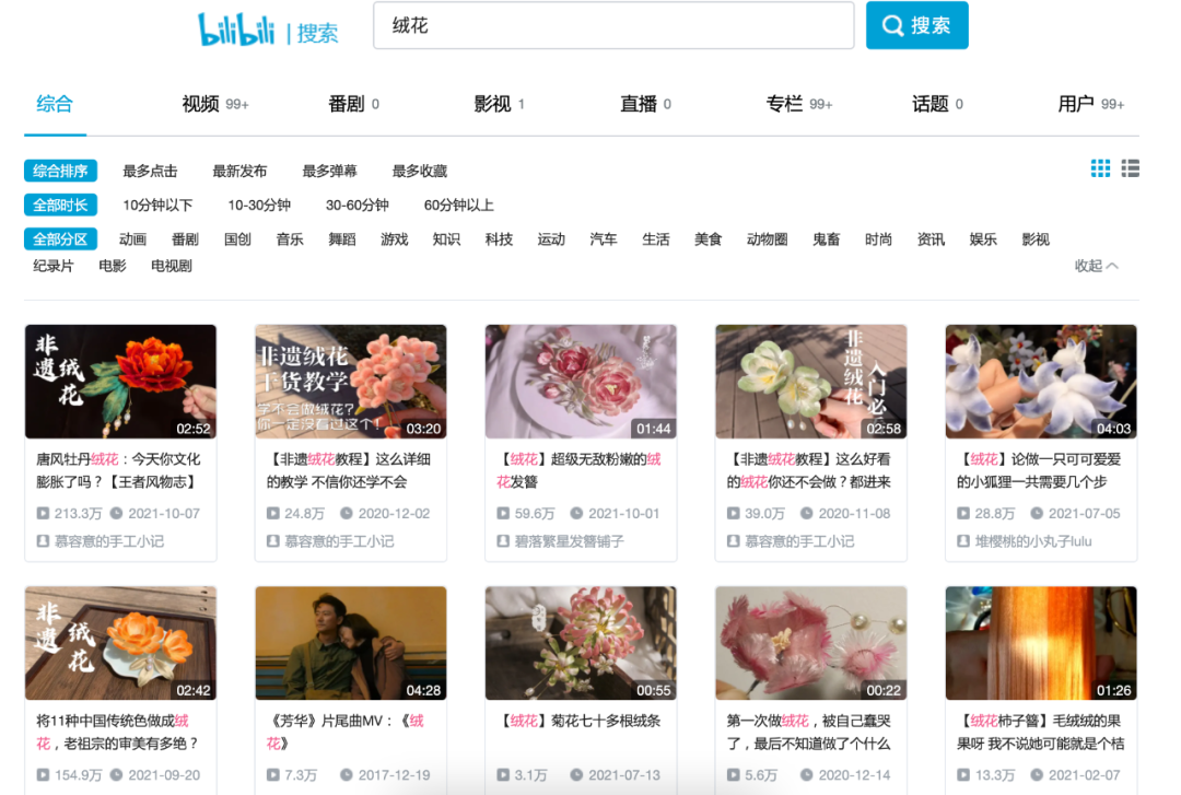 随手一搜发现,传统的首饰制作已经赢得了年轻人的关注与喜爱。光是绒花相关视频就已经有许多,并且10万+播放量的视频不在少数。