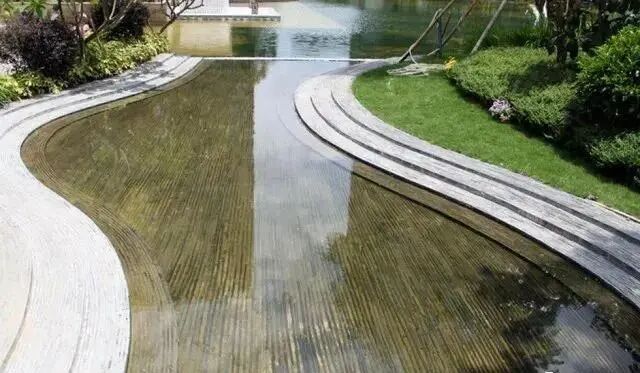 在水景观中利用曲线的流动性不仅可以起到陆地与水域的过渡融合,也可以使游人在滨河漫步游览时有一种随水而动,视觉变化丰富、层次多样,整体性连续性强等特点。