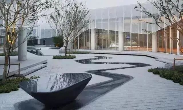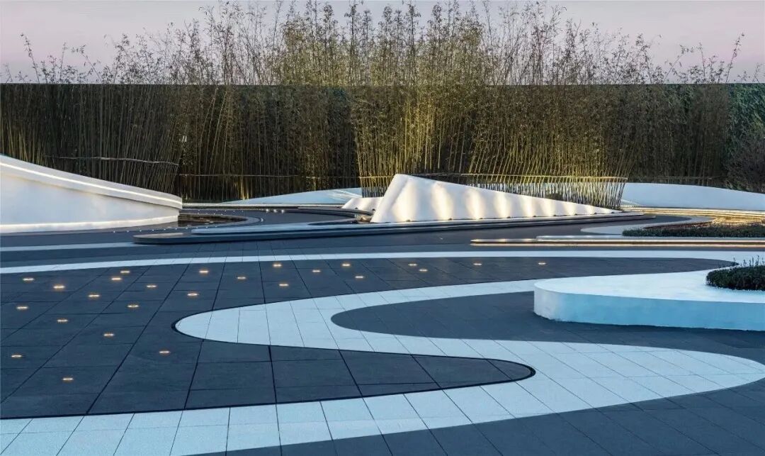 流水铺装线条与入口叠水相互融合,