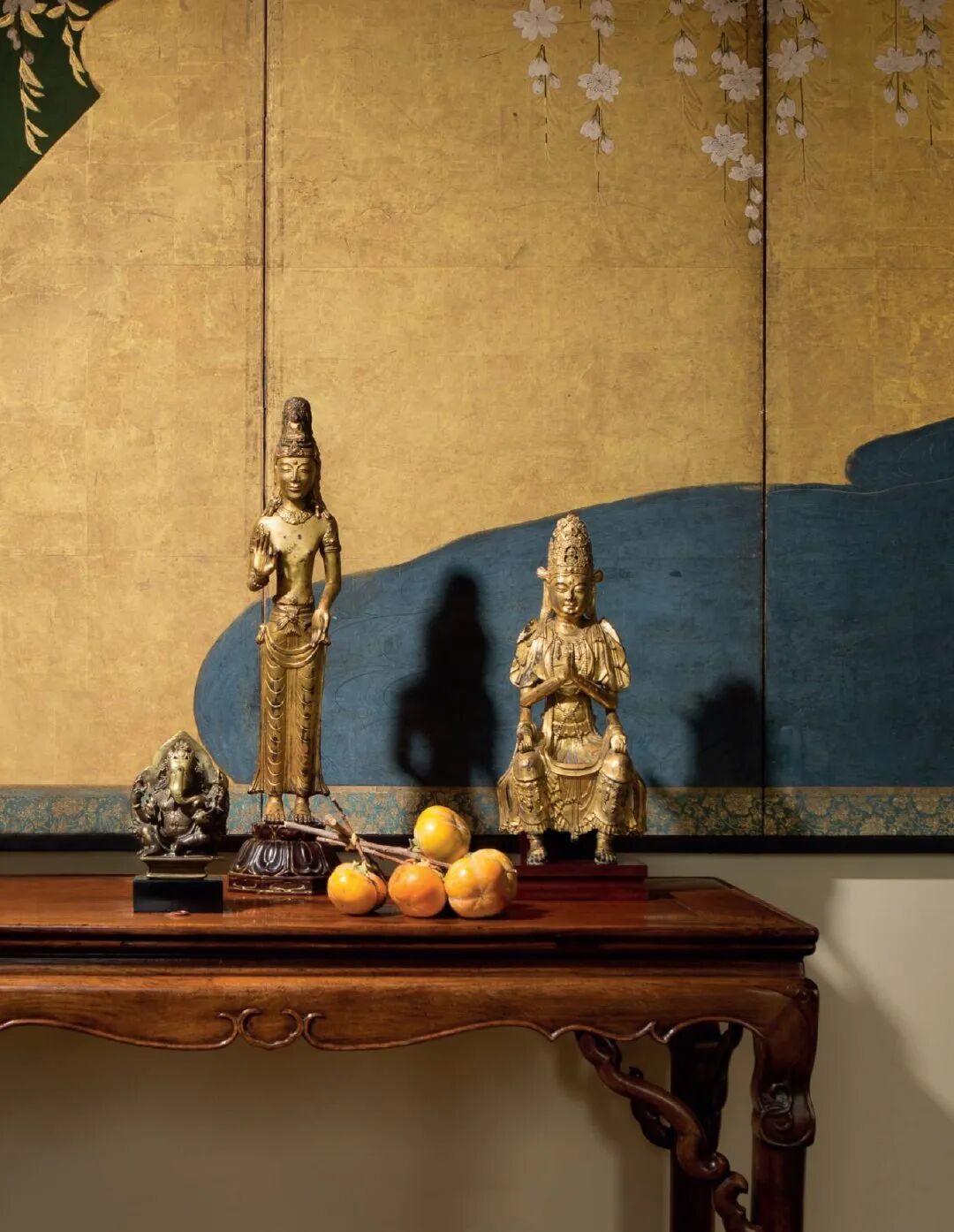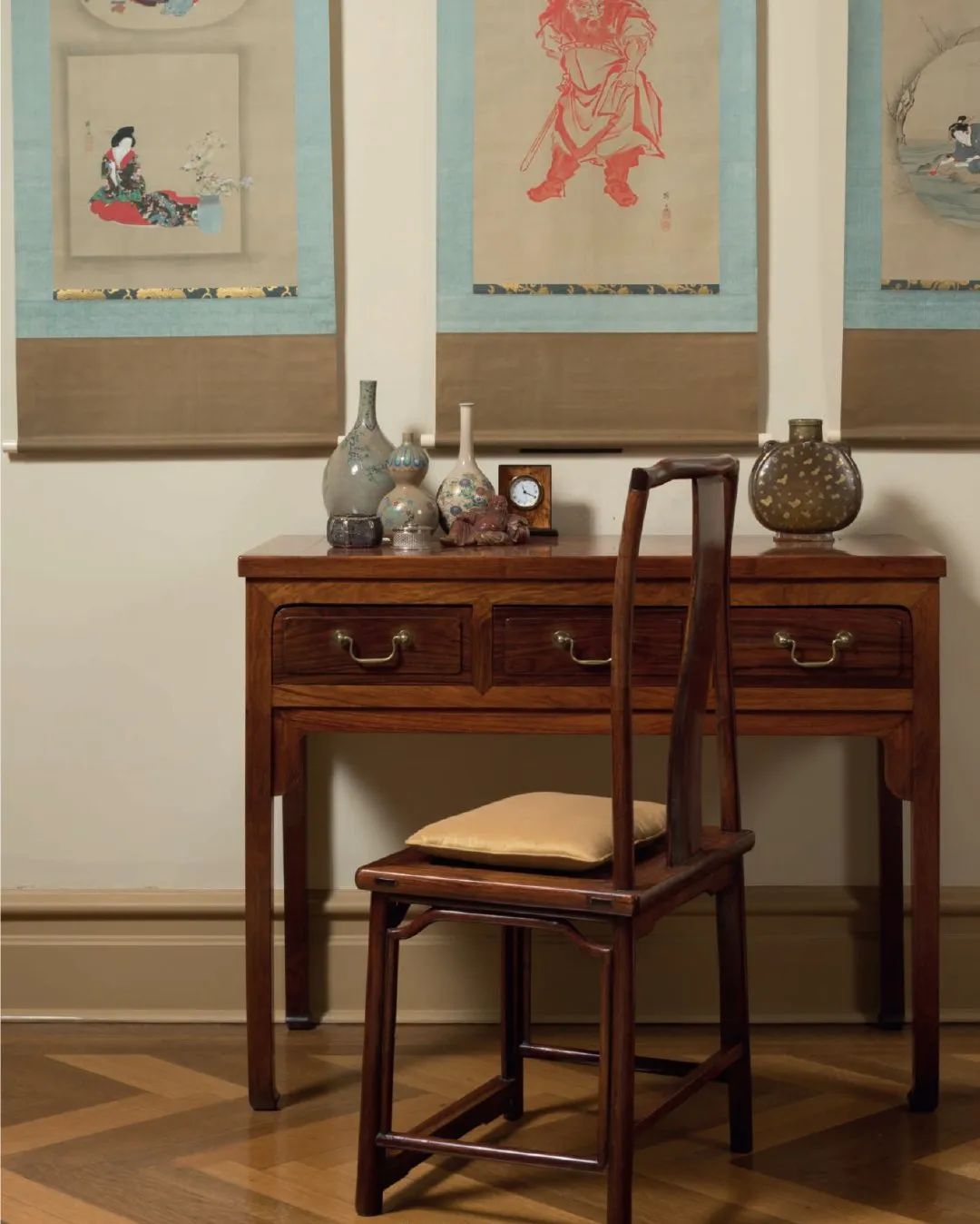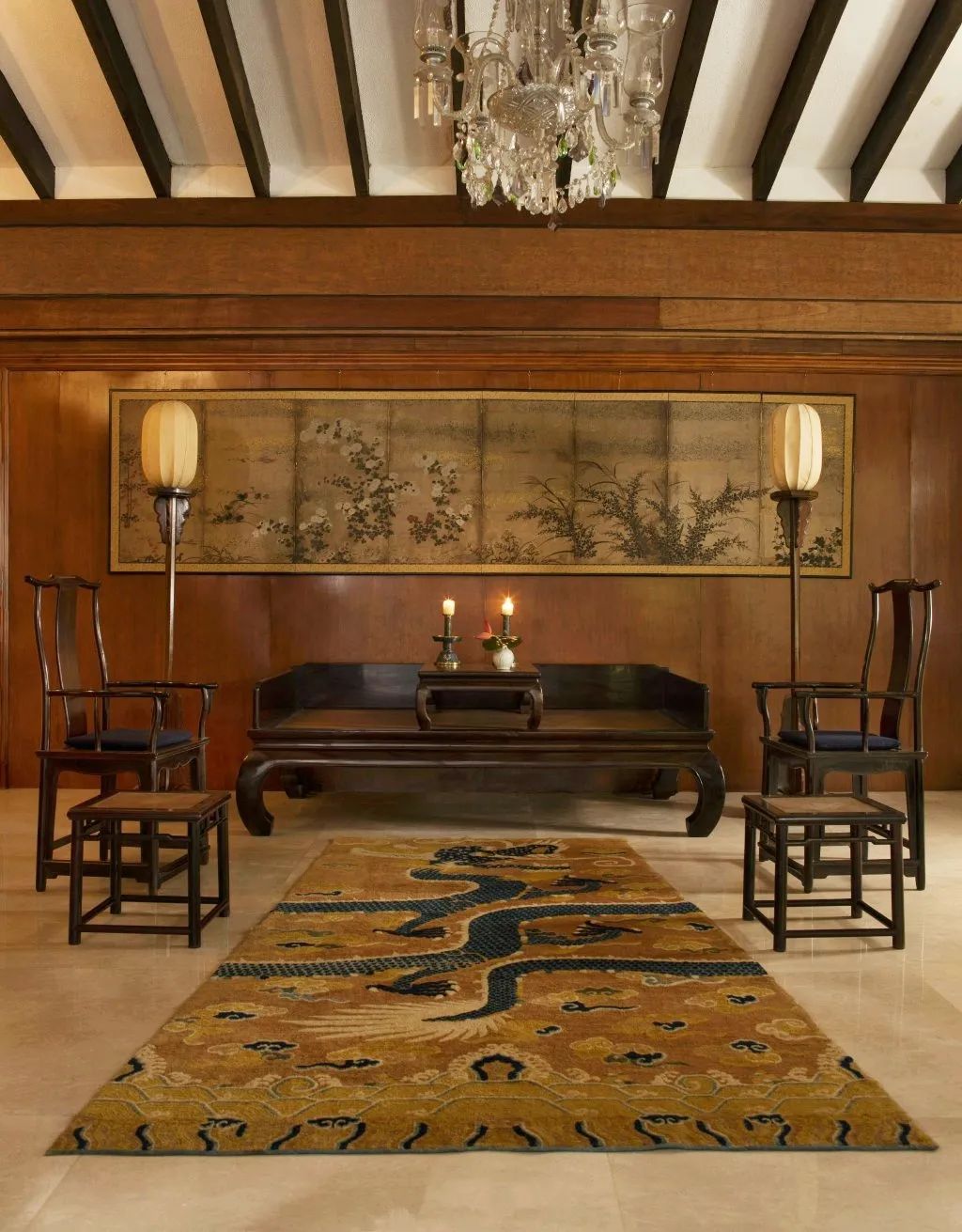 多宝格中的宋元明清瓷器错落有致,墙上嵌有色彩鲜活的元代道教壁画或是挂着具现代气息的中国书画,明清家具随处可见……