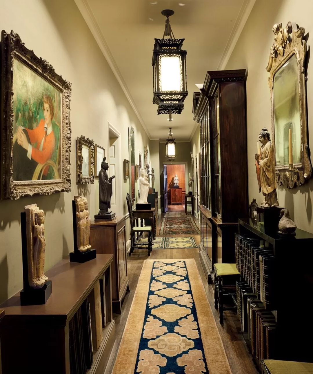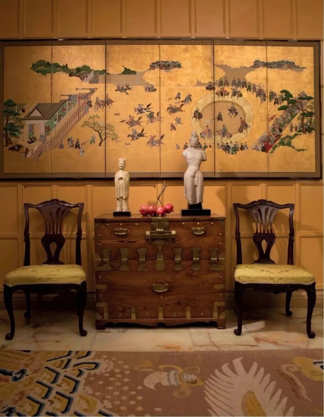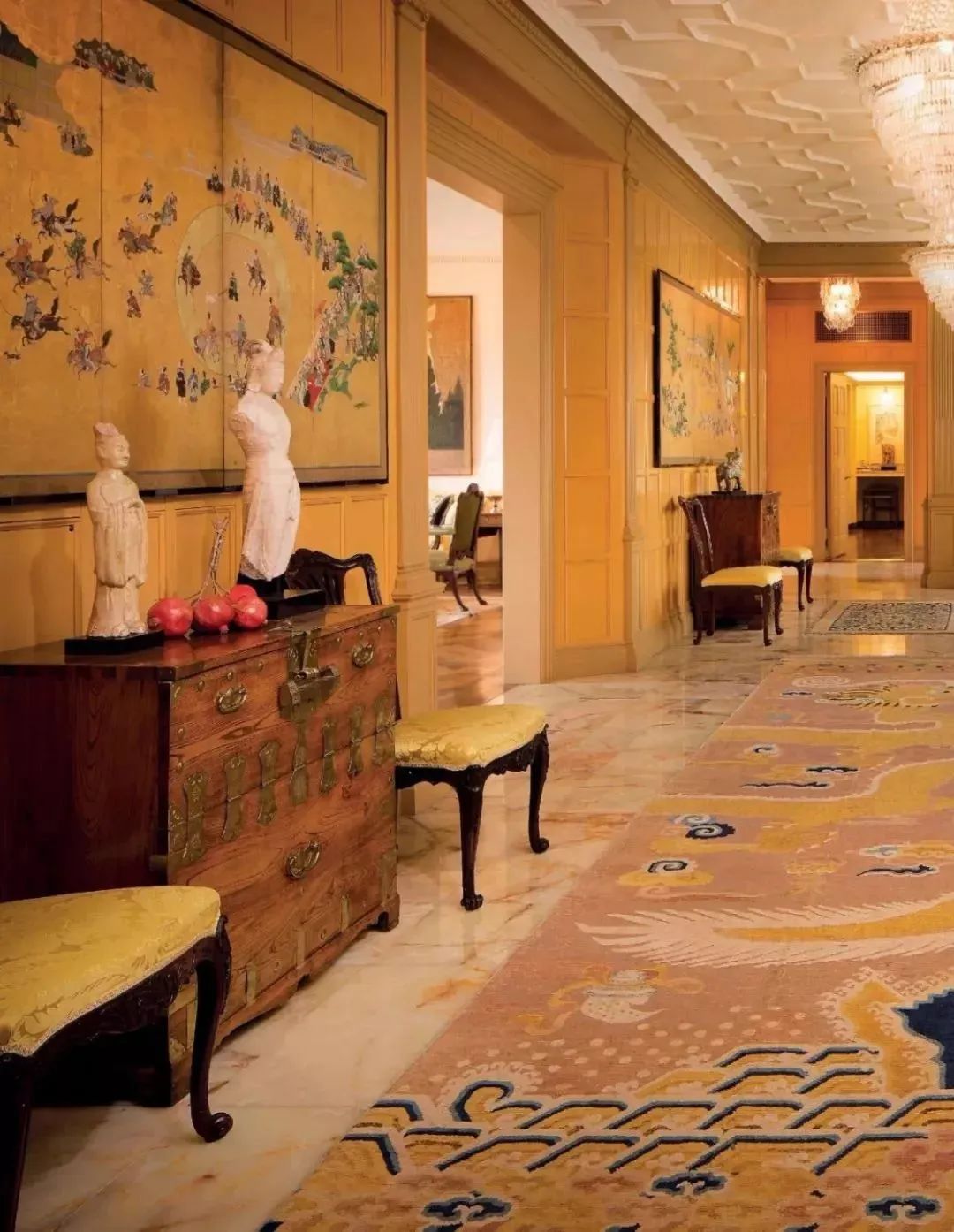 唐代陶俑静静立在门旁,地上铺着清代有瑞龙图案的宫廷地毯,唐代石刻思惟菩萨和古代印度雕塑依墙而立,长条案几上是东汉的青铜车马;