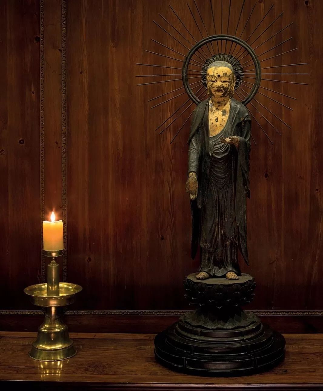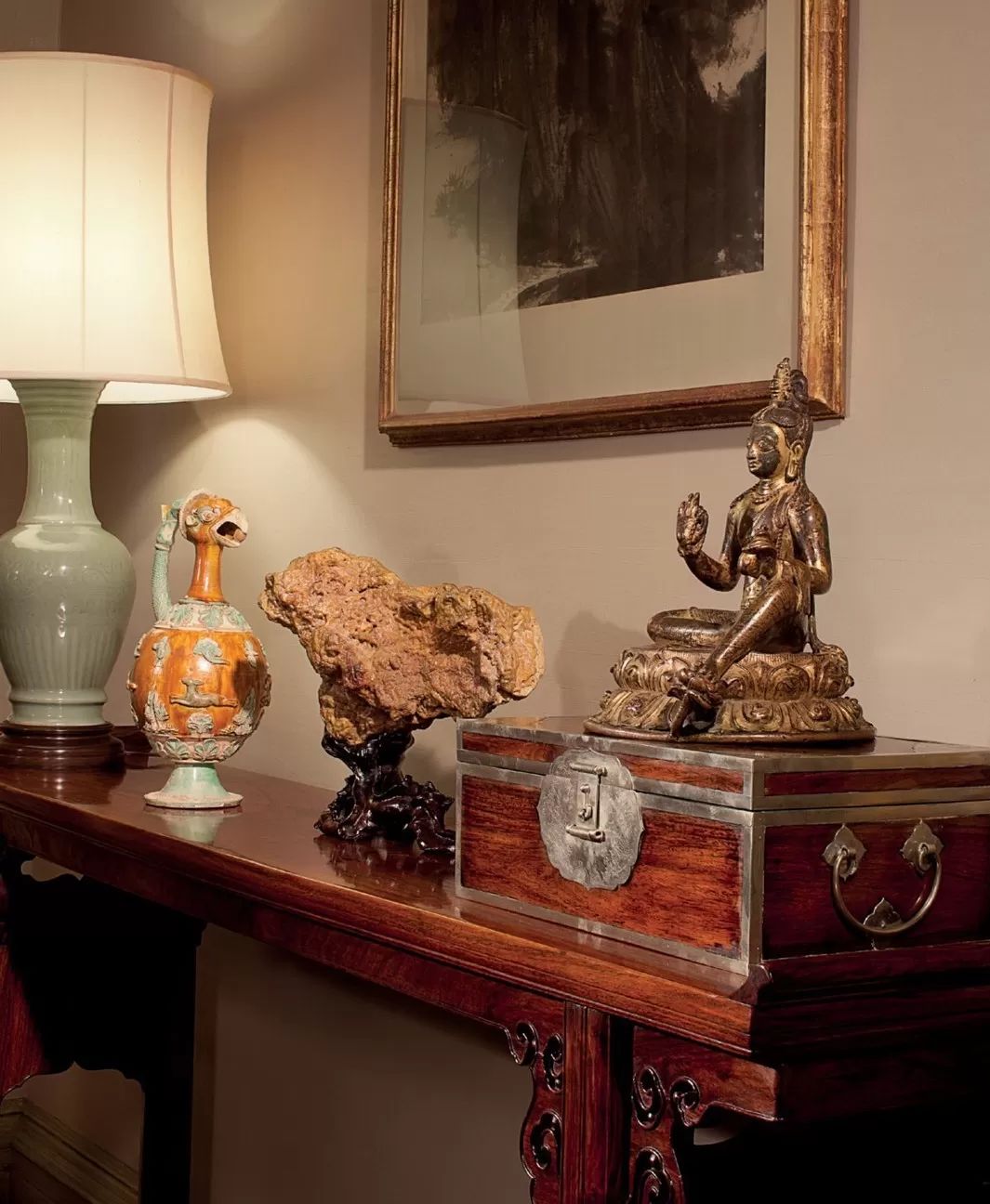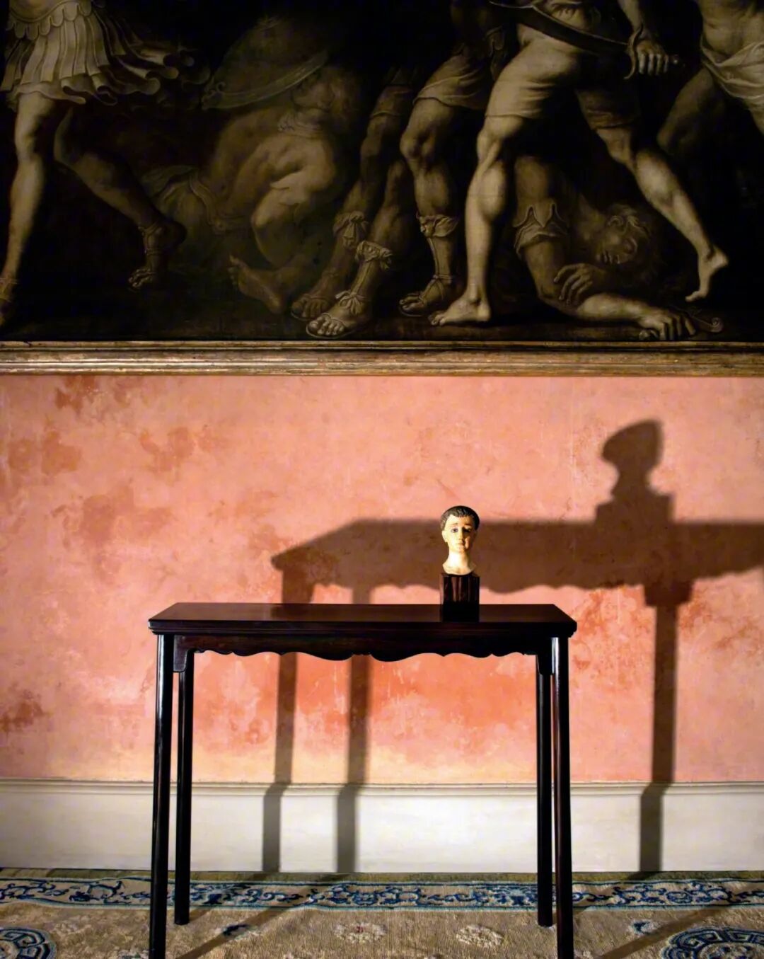 唐代陶俑静静立在门旁,地上铺着清代有瑞龙图案的宫廷地毯,唐代石刻思惟菩萨和古代印度雕塑依墙而立,长条案几上是东汉的青铜车马;