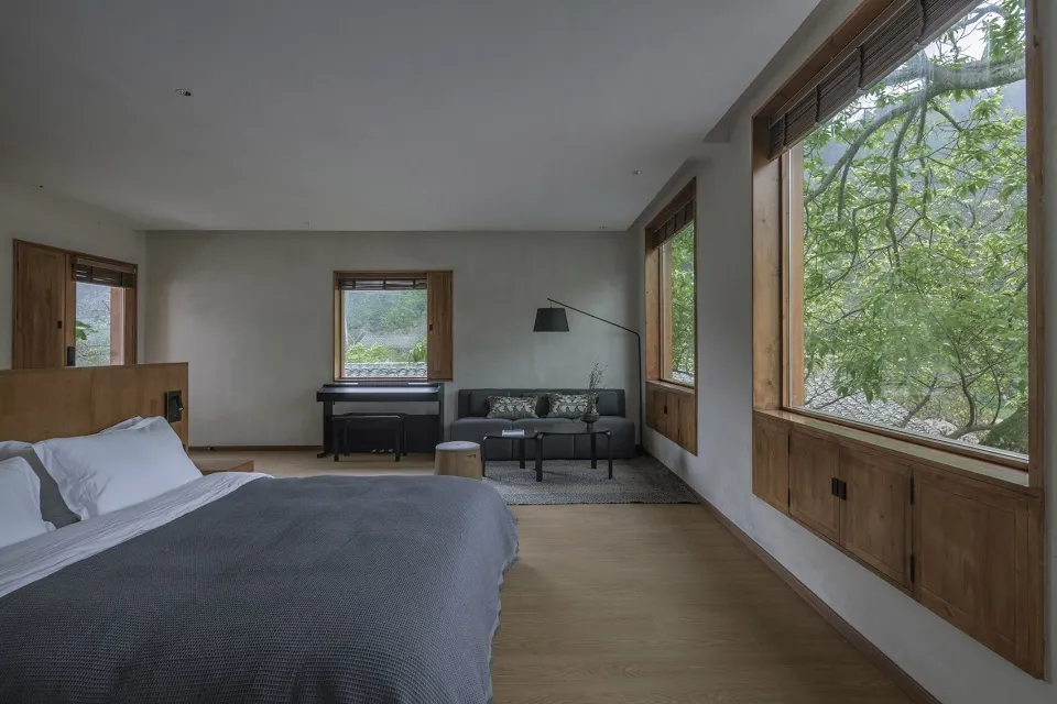 民宿的13间客房,都是由原有的校舍改造而来。南楼的标准尺度教室被设计为带有夹层的客房,窗口面向溪流与古树;北楼西翼的音乐教室被设计为三面景观客房,其余办公室和员工宿舍根据面宽和进深被设计为一到两开间的标准间。所有客房的阳台或窗口,都有不同的景观视野。