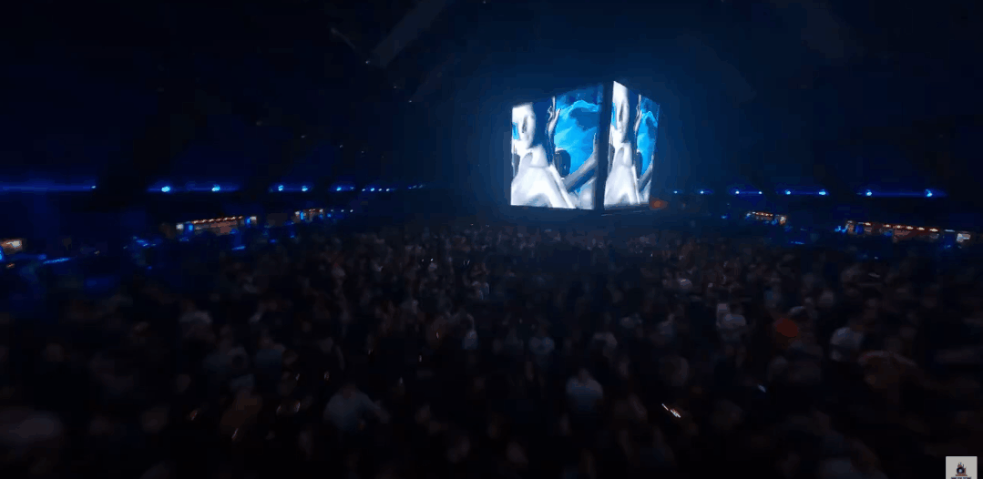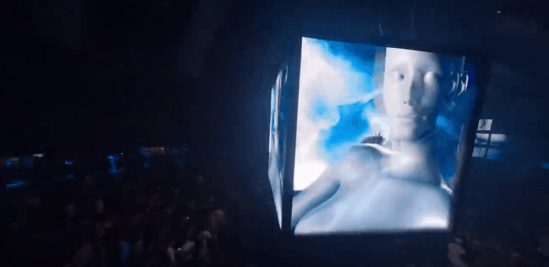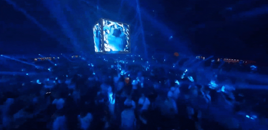 正方体悬浮装置并非只是简单的装饰,它由四面LED屏组成,360度的立体设计让坐落于不同位置的观众通过屏幕将表演看得清清楚楚。
