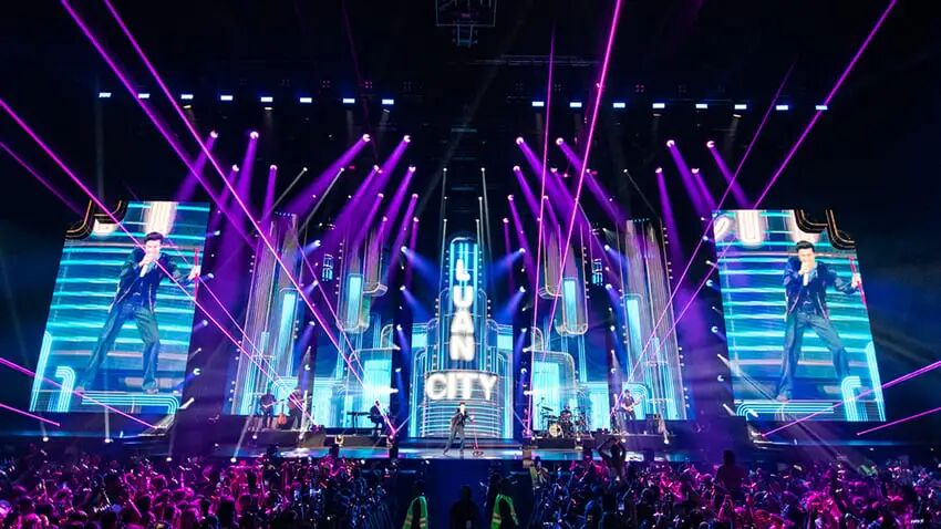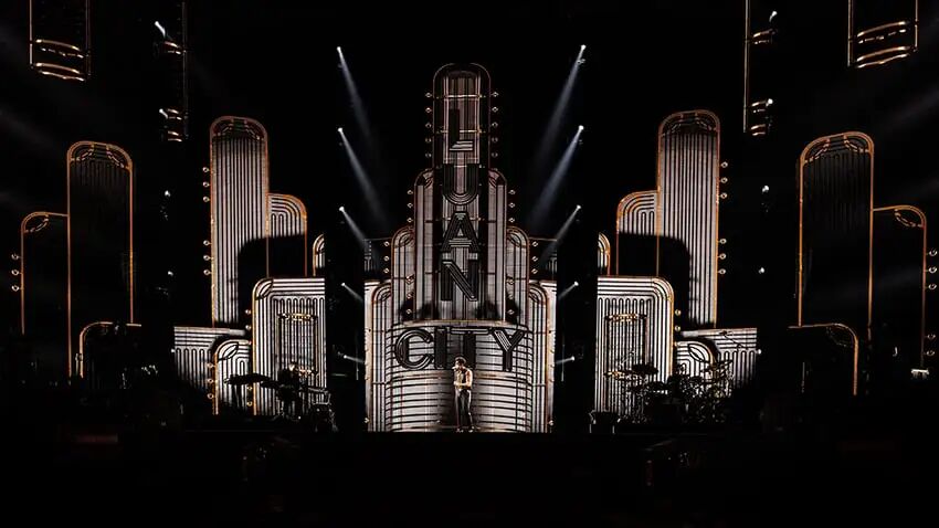 这次的舞台设计与卢安过往的演唱会有很大不同,位于舞台中心的钢铁建筑并非实物,而是通过屏幕呈现出来的虚拟画面,重现了“Luan City 1.0”的舞台场景,勾起现场乐迷的回忆。