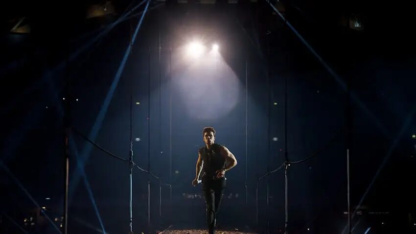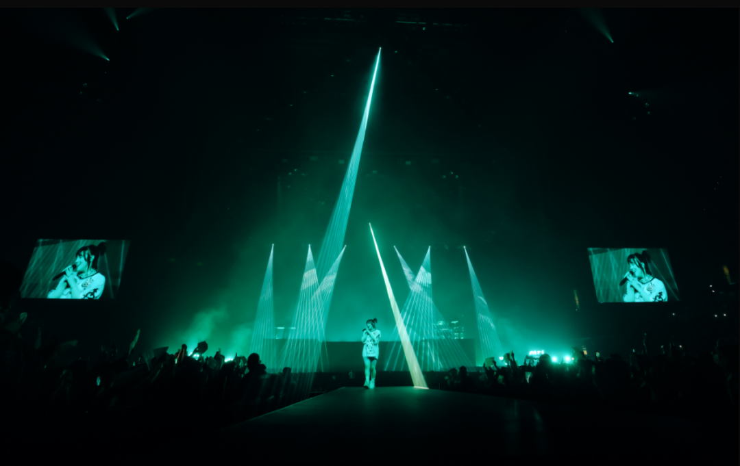 巧妙的灯光设计加深了现场空间的纵深感,当灯光交错照射时,仿佛形成一张巨大的网,将比莉与乐迷笼罩在一起。