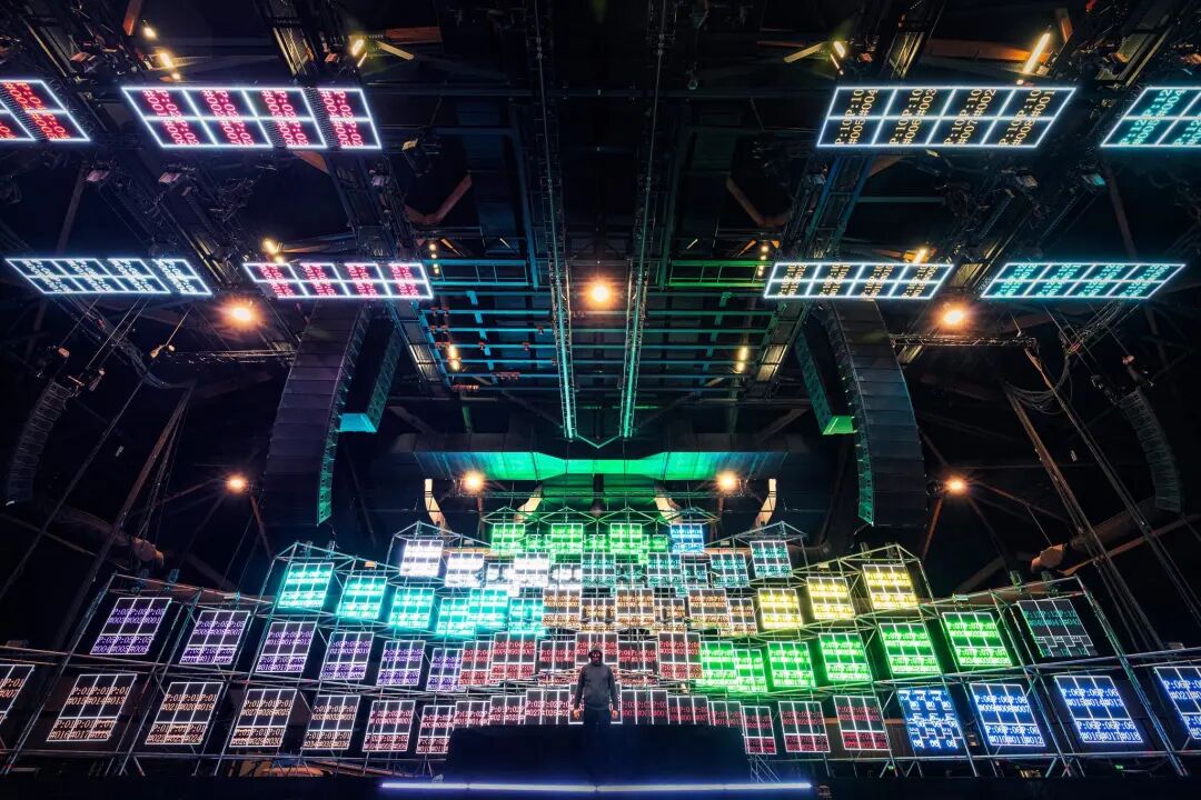 巨大的LED屏幕之间被安装了真实的灯具和霓虹灯条,当光束击中舞台地板时,灯光阴影赋予了这个钢铁建筑更真实的视觉效果。