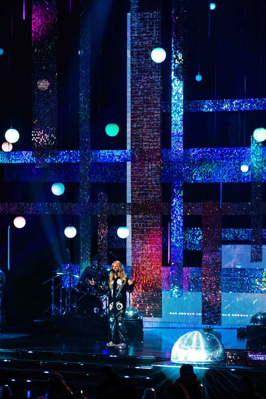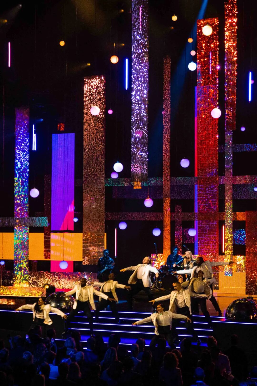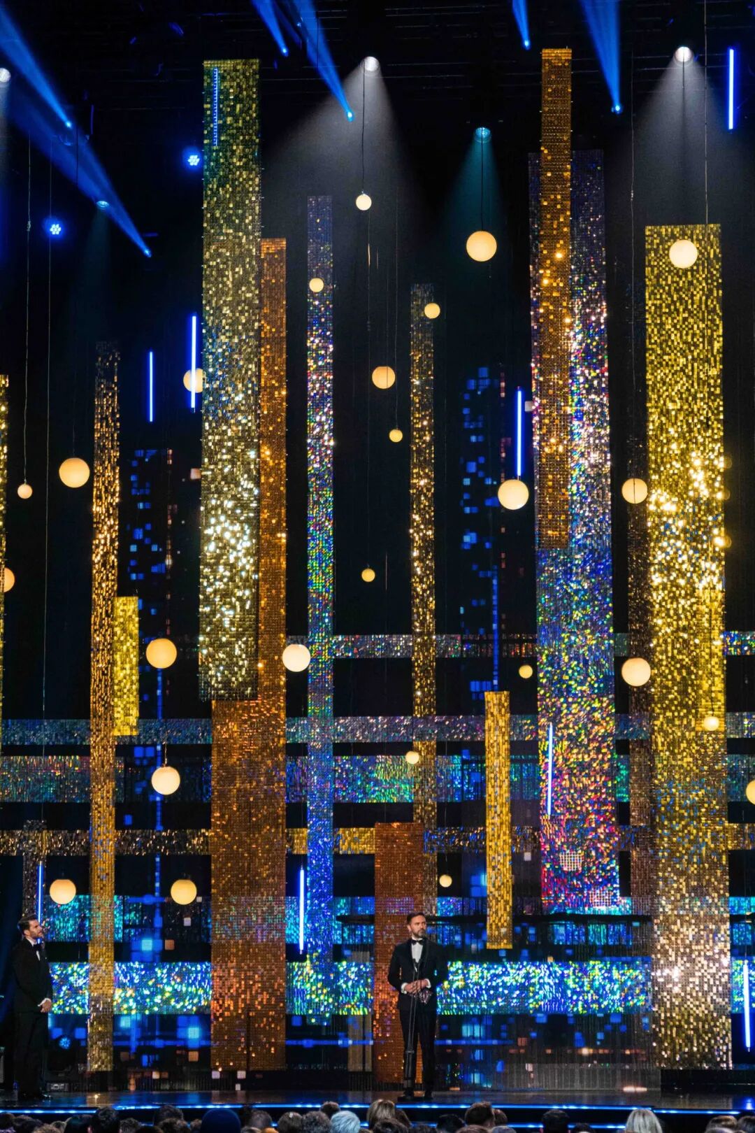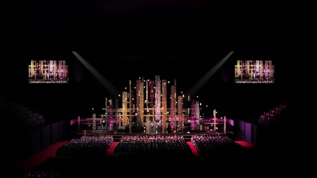 现场布景以垂直和水平相结合的形式呈现,令舞台沉浸在流光溢彩的分层景观中,闪闪发光的画面将舞台塑造得富丽堂皇。