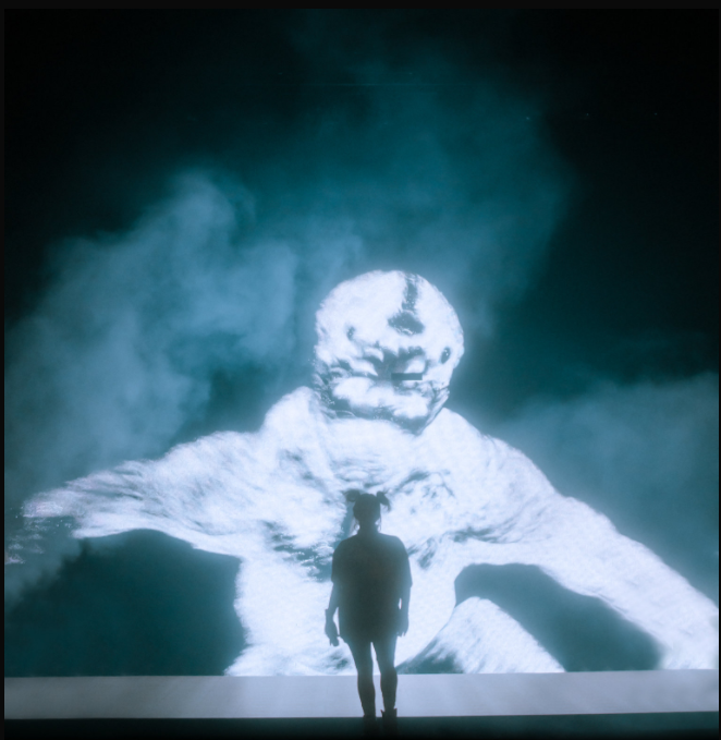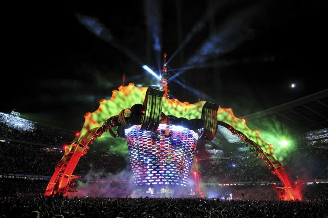 LED屏随着歌曲变换播放不同的元素,巨型的钢铁蜘蛛,看不清五官的异形人,熊熊燃烧的山林…将整场演唱会塑造成一出科幻电影。