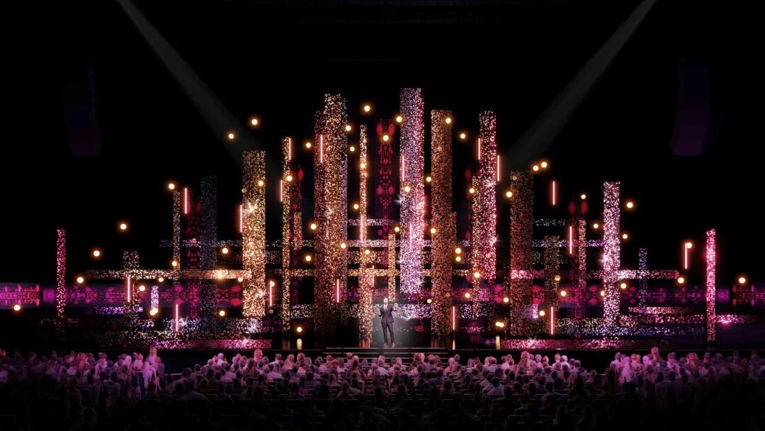 Stufish为今年的NTA打造了以“光之城”为主题的舞台布景,整个舞台采用金、铜和虹彩闪光板作为舞台主要元素,为观众营造在“光之城”中遨游漫步的梦幻感。
