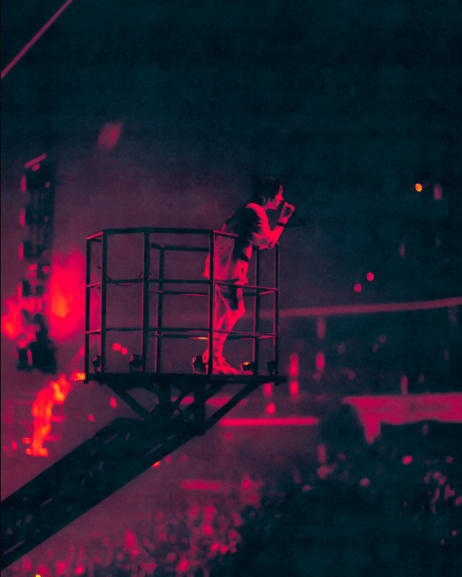 演唱到歌曲《DNA》时,连接主舞台与副舞台的走道被投影成了一条高速公路,LED屏也适时播放了汽车急转直下的画面,独特的舞台设计为现场乐迷带来沉浸式的“赛车”体验感,同时将紧张的气氛推至高潮。