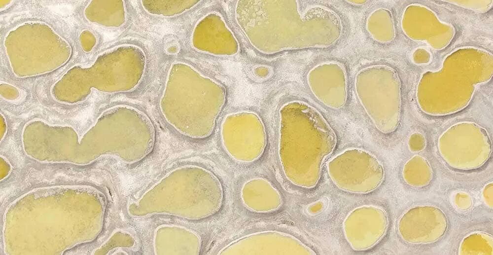 在冬季和春季,位于加拿大奥肯那根山谷的一片湖泊看起来就像地球上的其他湖水一样,但随着夏季的到来,奇异的景象出现了,大部分水开始蒸发,数百个巨大的咸水池被留下,留下黄色、绿色和蓝色斑点的圆点景观。