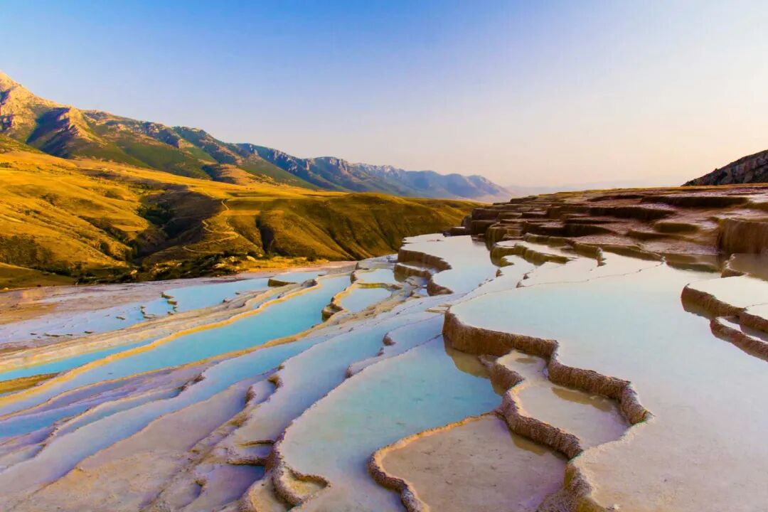 这个石灰华梯田是由两个矿物温泉流出的水沉积的数千年石灰岩的结晶,由于矿物质含量高,人们认为这些温泉具有药用价值。