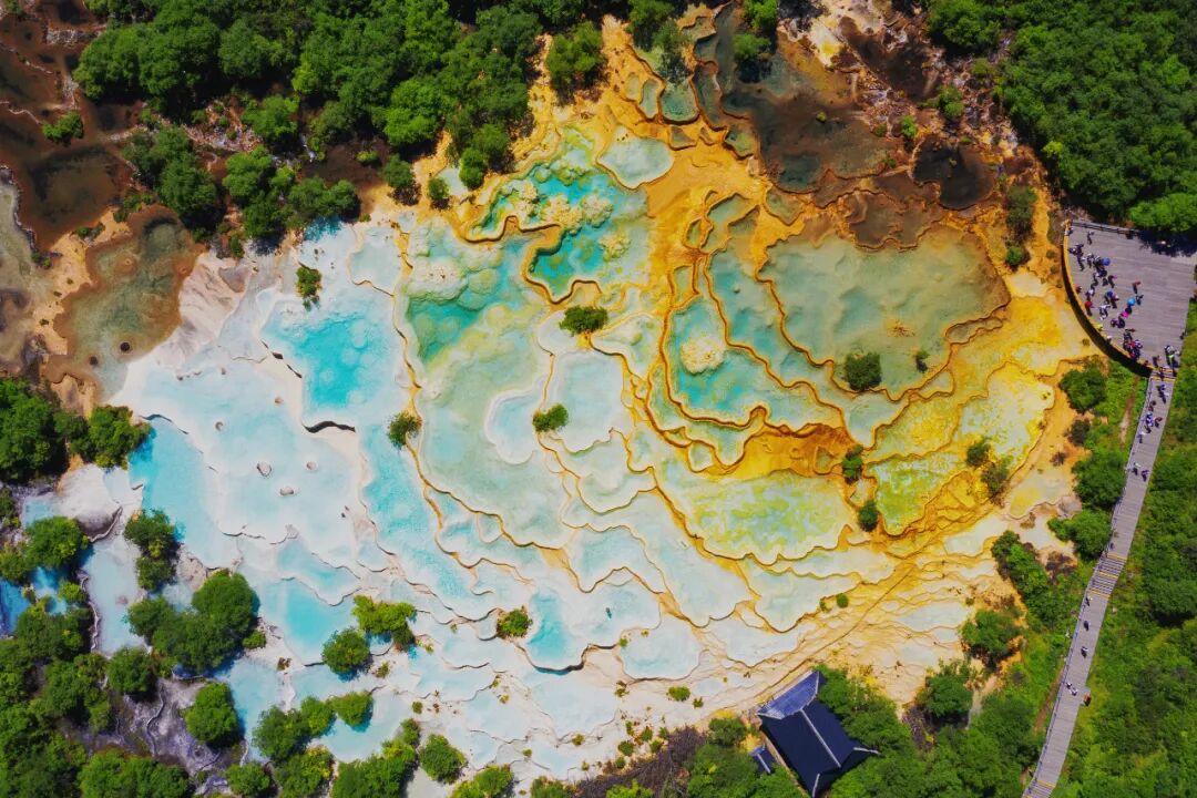 远远望去,五颜六色的层状阶梯此起彼伏,而上方覆盖的水池则像倾倒的一层果酱,可口动人。