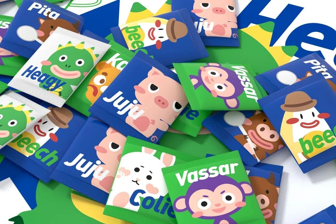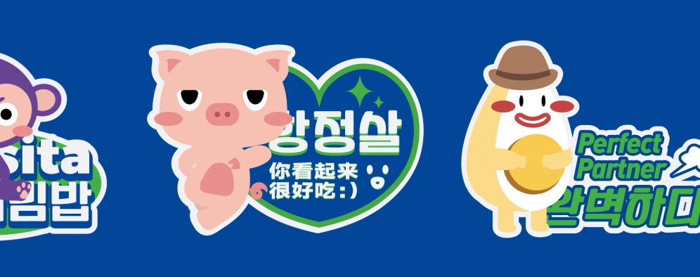 视觉上,采用济州蓝、辣酱红、有机绿、米香白四种主色调,呼应美食特性。同时塑造了7个蠢萌的独特IP形象为品牌的超级文化符号,配以“锅锅加鸡蛋,干饭要拌拌。”的slogan,加深用户印象。