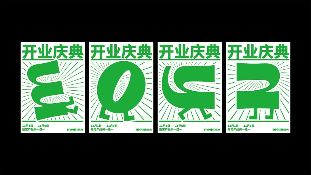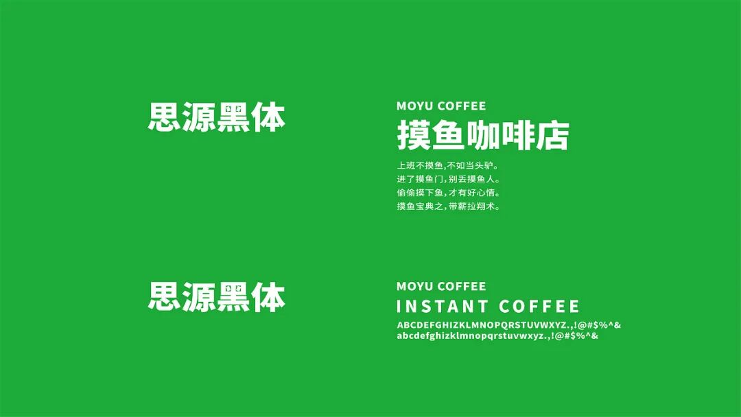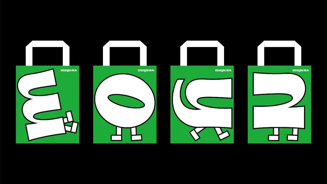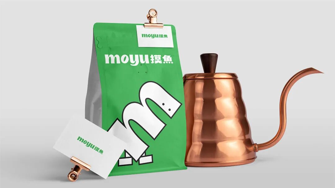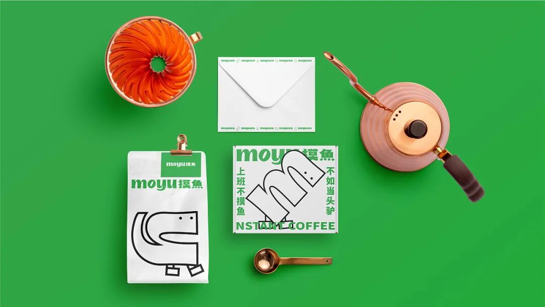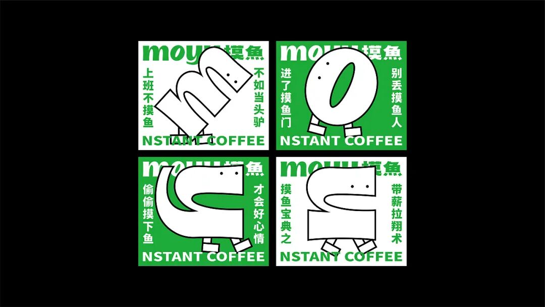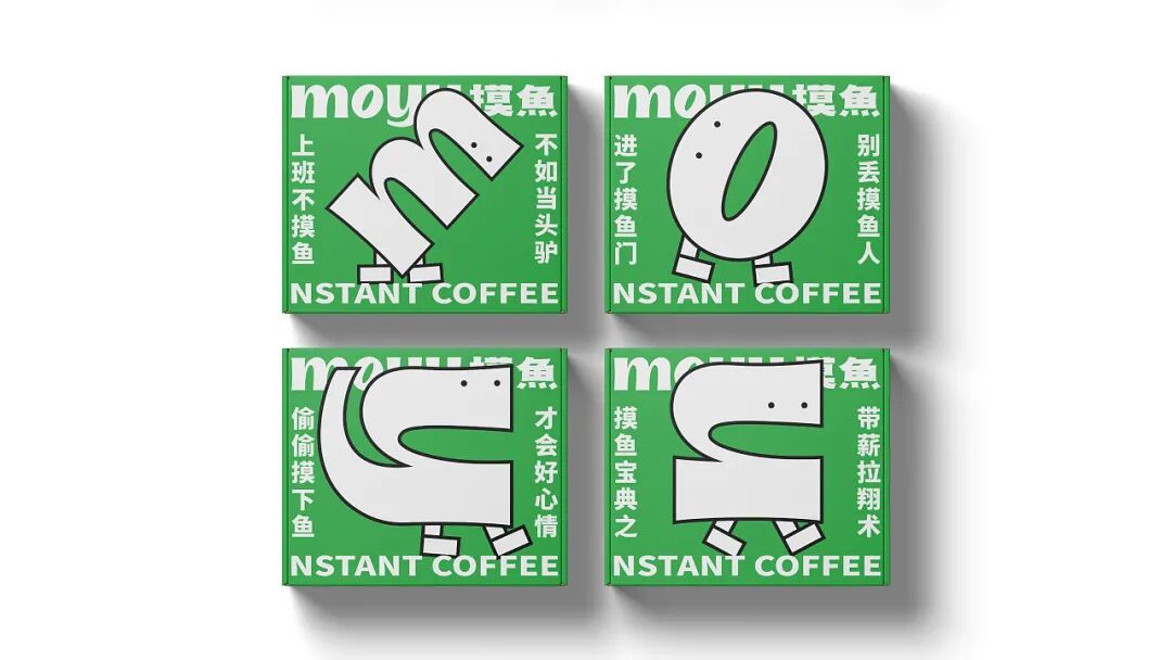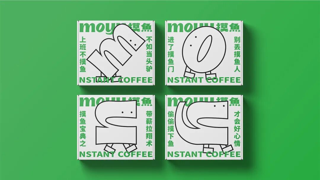 再来看整体的视觉设计,绿色调的渲染清新亮丽,营造一种放松、休闲的“摸鱼”氛围,从色彩上引导消费者情绪,学会在这片小天地中放松自己。此外产品包装上,抽象的线稿插画以“摸鱼”的拼音形式设计,并将其拟人化,增加趣味和互动性。