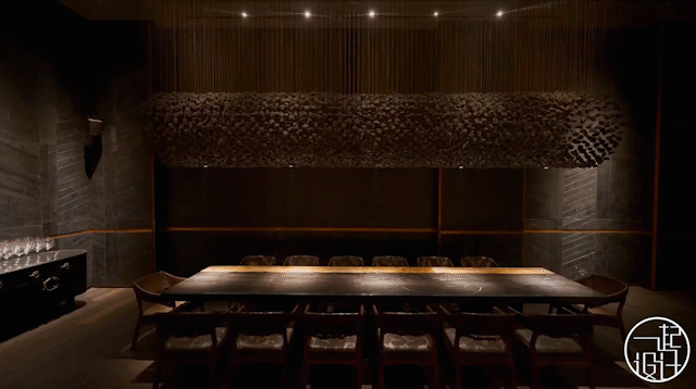 餐厅的洗手间延续了整体风格,青铜铸造章鱼触角把手,与延伸到屋顶的艺术画呼应,水槽是用 1000 万年前的化石木雕刻而成的,昏暗、复古,很有格调。
