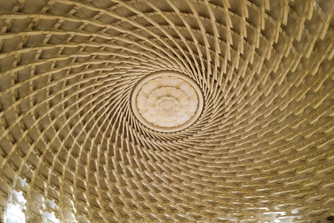 ▲ 漪园建筑中寓意钱江潮的藻井,对东阳木雕和榫卯结构都进行了革新演绎,最顶部镶有8瓣莲花。建筑物前还修筑了直通临西湖游船码头的游廊。让登船过程和散步体验更从容优雅,不受天气制约。