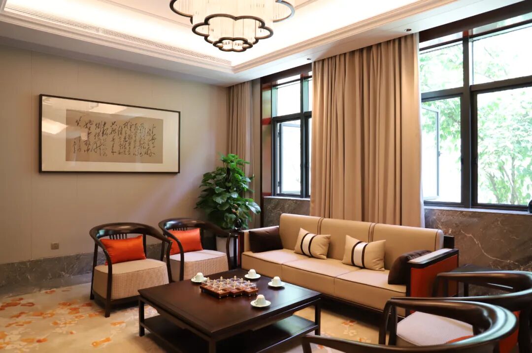 3号楼刚好临近半岛的端头处,其中的不少客房都附有直面西湖的院子或露台,入口门厅还在壁面嵌入了古琴,将汪庄原主人对古琴的偏爱与如诗如画西湖景有致交融,身处其间,仿佛能感受到古琴的音律与湖面的柔波间的互动。