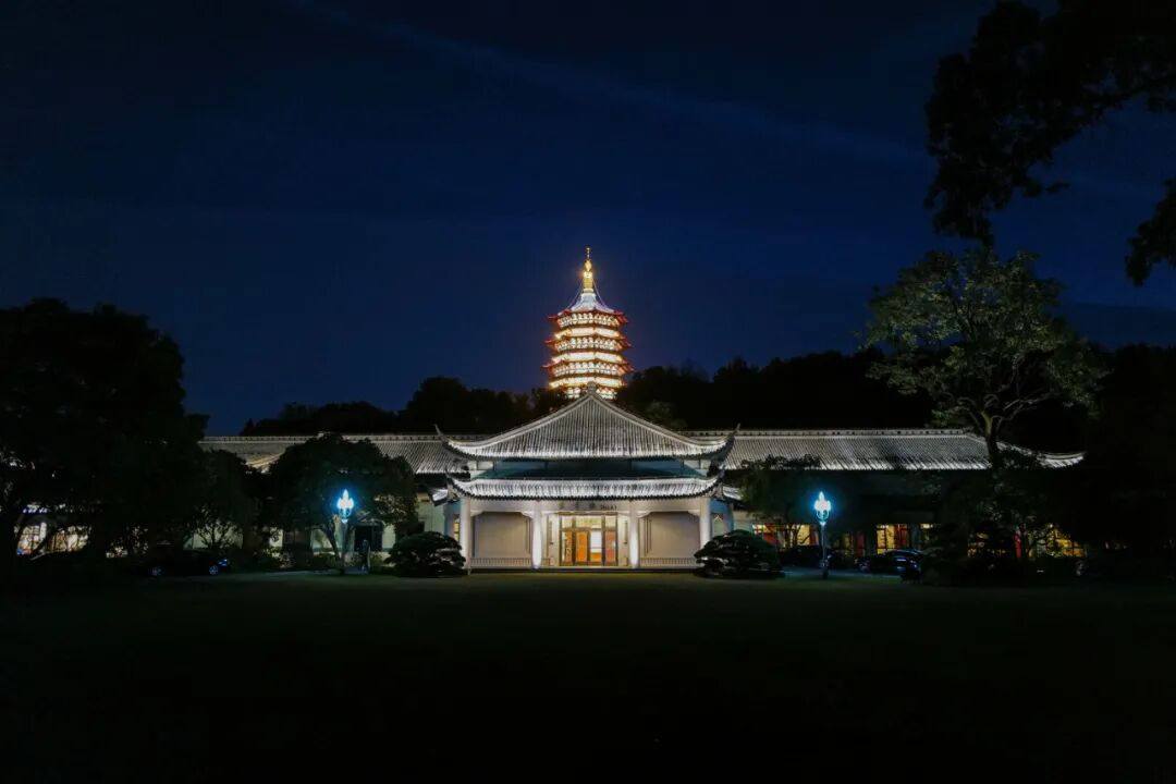1958年,选址得天独厚的汪庄,在建筑名家戴念慈先生(代表作包括中国美术馆、北京饭店西楼、北京展览馆)主持的改造设计中,于这座湖畔绿洲中孕育出了一组优美端庄的新派中式建筑群,既与绿洲从容共处,也与如今被复建的雷峰塔和谐交融得恍若一体,其恒久的风格和极具前瞻的创见令人拍案。