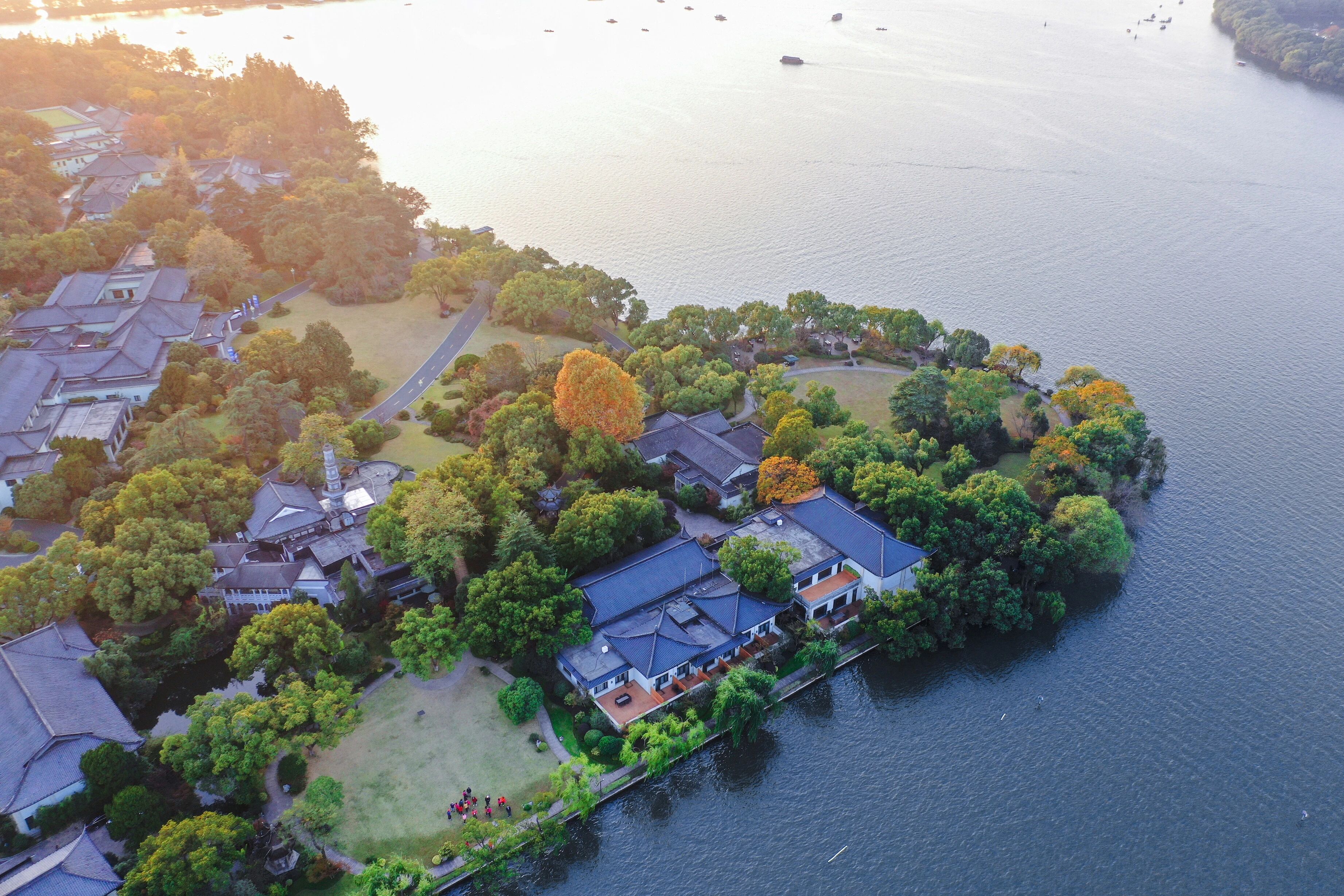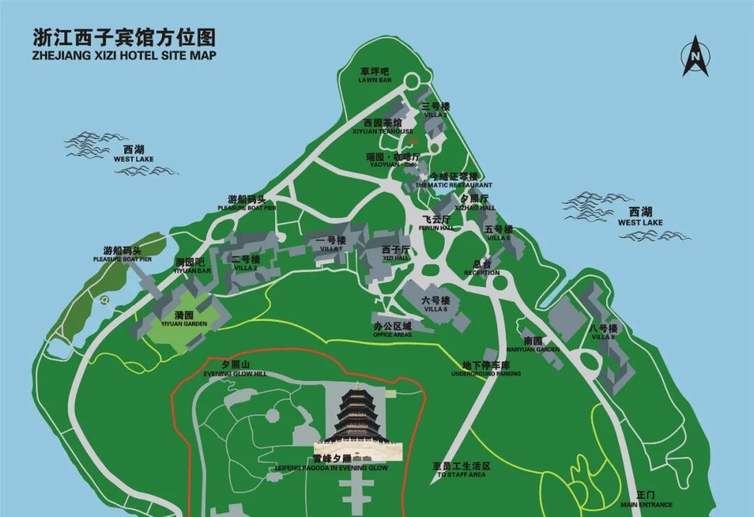 浙江西子宾馆处在西湖南侧,独占一块三面为西湖水环绕、背靠雷峰塔的半岛地带,坐拥近300亩静谧绿洲和1560米西湖水岸线。对于沾西湖水即可尽情凡尔赛的杭州而言,是太受眷顾的存在。