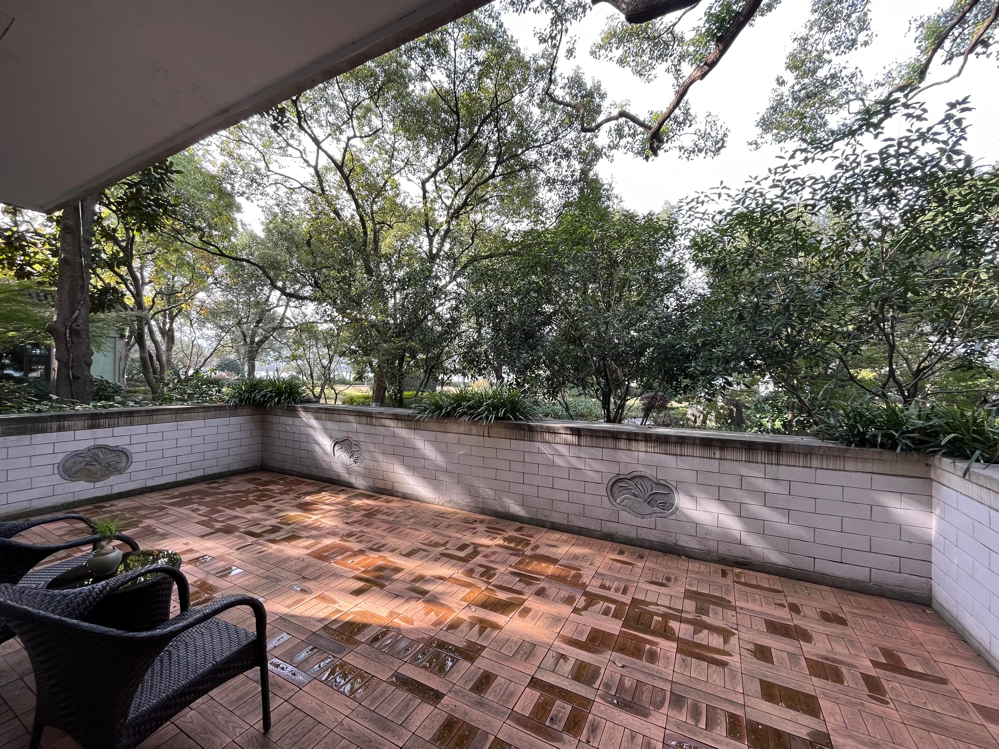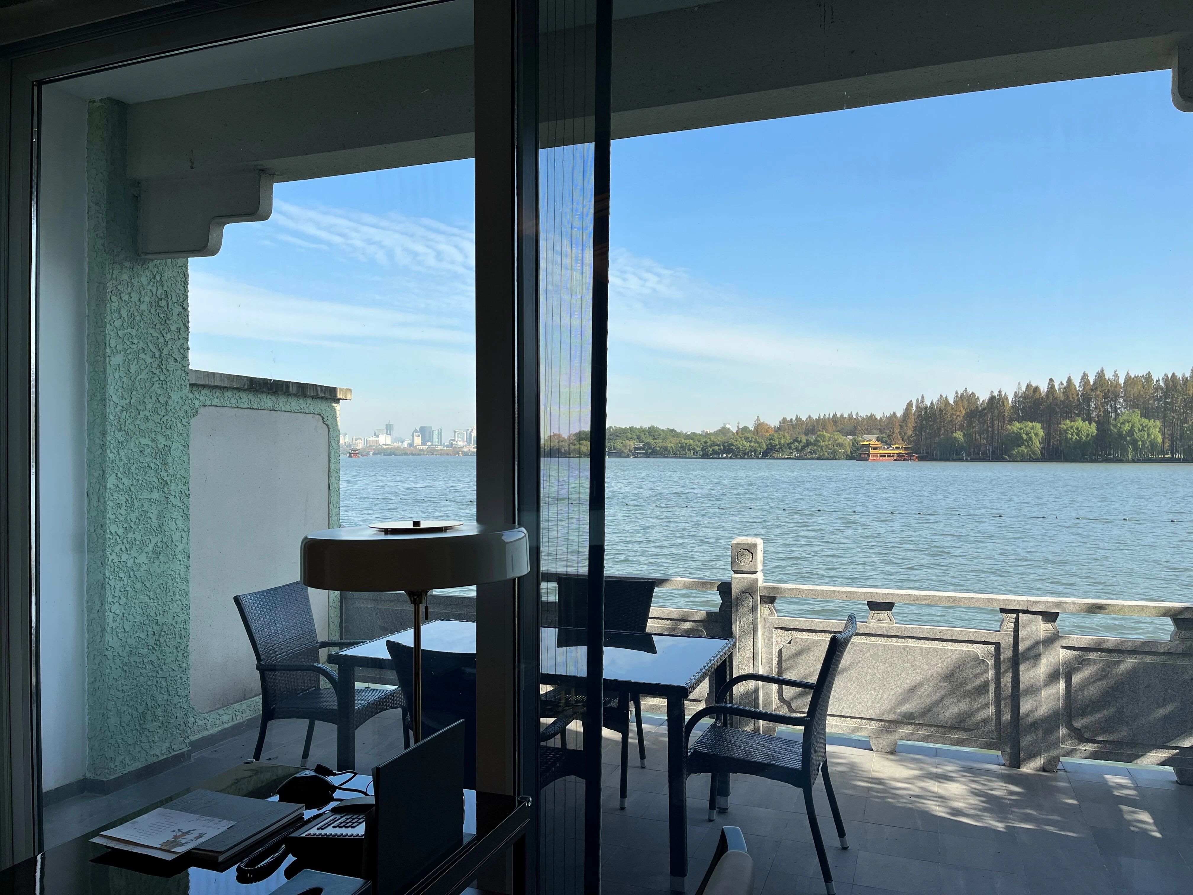 我此番在3号楼住到的客房有着开敞的露台,露台由众多参天大树环绕,透过大树可欣赏到直扑湖岸的宽阔草坪和怡人的西湖水。如果时间再宽裕一些,我一定会把备在房内的茶器、茶叶和虎跑泉水挪到露台上,静静品一下午茶。