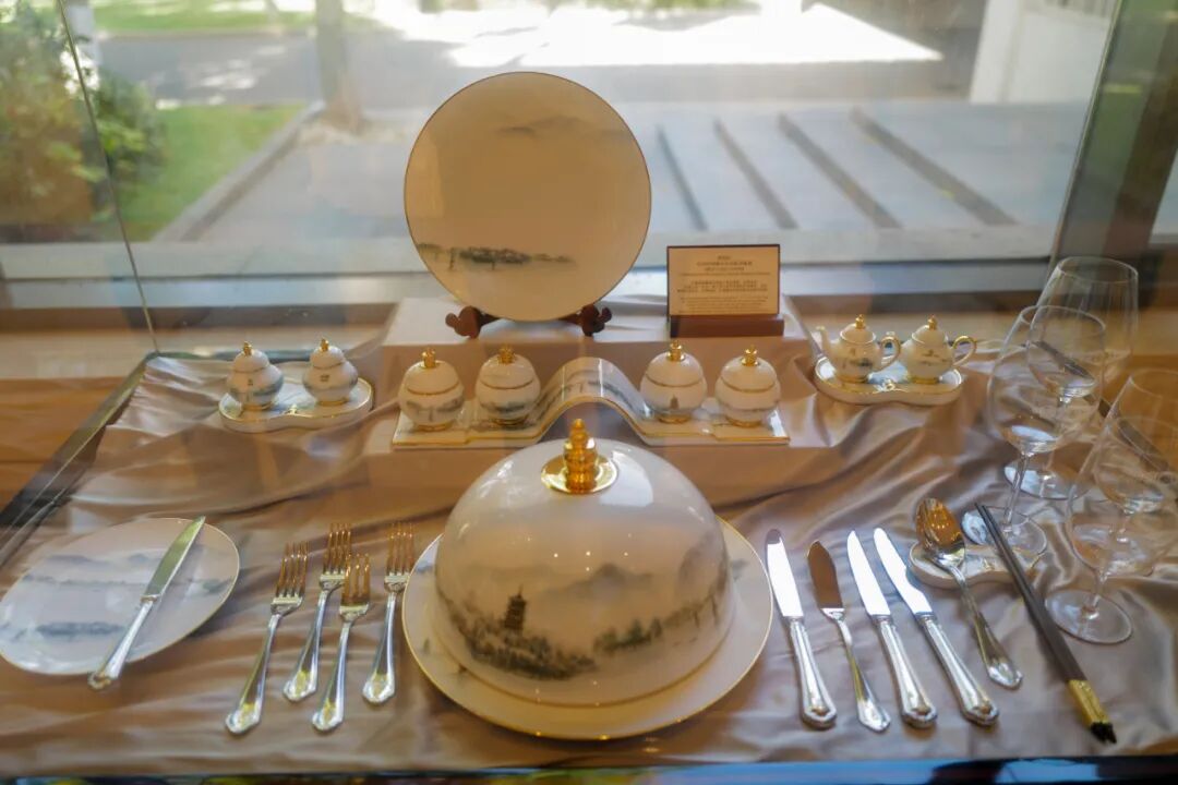 漪园宴会厅的门厅里,还特地陈列了一套峰会时,普京所用的部分晚宴餐具,其不仅通过瓷器面上的画面和器具的形态描绘出西湖的景致和神韵,甚至还特意在调味罐上为从俄罗斯远道而来的普京附上了俄文标示!