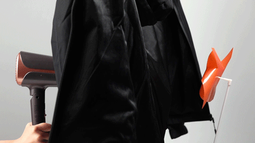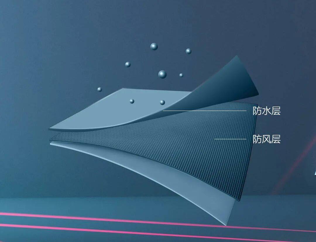 防风:防水层之下多了一层防风面料,将衣服挡在吹风机和风车中间,风车立马停止。