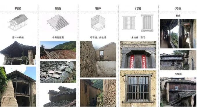 对松阳民居聚落的乡土建构体系展开研究,梳理与当地自然资源、气候环境、复杂地形、生产与生活方式及文化特征相适应的空间型制和稳定的建造特征,为保护传统聚落风貌提供设计依据;在技术上学习现代夯土修复技术,调整材料配比,优化材料性能和技术工艺。深入研究当地地域建筑构架、屋面、墙体、门窗、构造细部等建筑元素和材料,并对其整理分类,作为之后改造更新设计的参照基础。