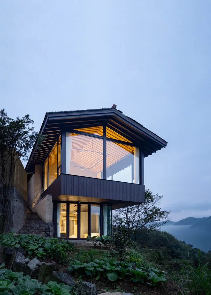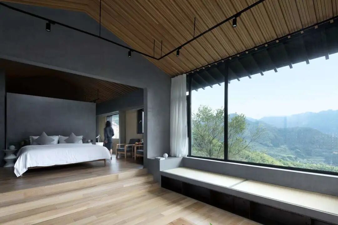 a.利用玻璃增加室内通透感:原有老建筑的层高低矮逼仄,无法满足现代居住空间的需求。、将原有建筑屋面整体抬高,高度合理分配至上下两层,为室内设备安装预留空间,同时创造舒适的居住体验。在二层悬挑一个玻璃体量,既可以作为室内空间的延伸,又能更好地收纳峡谷景观。床顶部的屋面加设了天窗,能够增加空间的通透性和让游客更好地欣赏夜空。