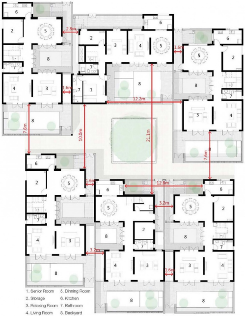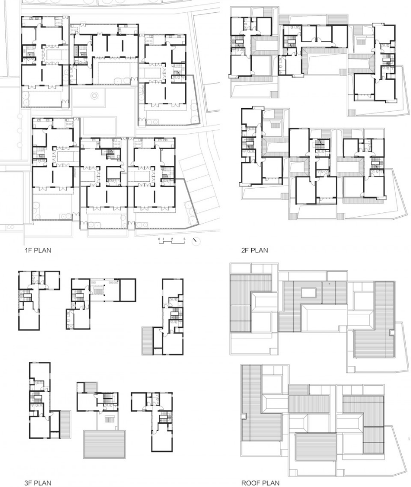两个基本单元建筑基底的适度变化演变出四种类型,将单元通过前后错动、东西镜像形成一个带有公共院落的规模组团,与传统行列式布局相比,在土地节约性、庭院空间的层次性和私密性上都有显著提升。中心南面有一块大面积的广场,提供给大型活动使用。
