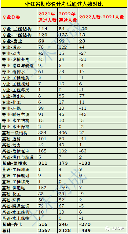 浙江省对2022年度勘察设计通过的考生进行了公示,总计2128人。其中一级结构专业通过人数为133人,比去年多13人;岩土专业人数为92人,比去年多23人,二级结构84人,比去年少30人。其中变化最大的是岩土基础246人,比去年的516人减少了52%,给排水基础173人,比去年减少了44%。总体人数比去年2567人减少了439人。