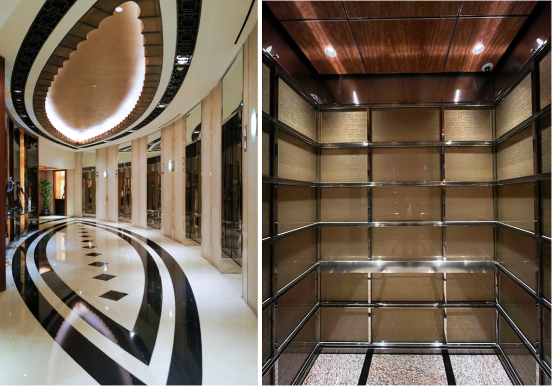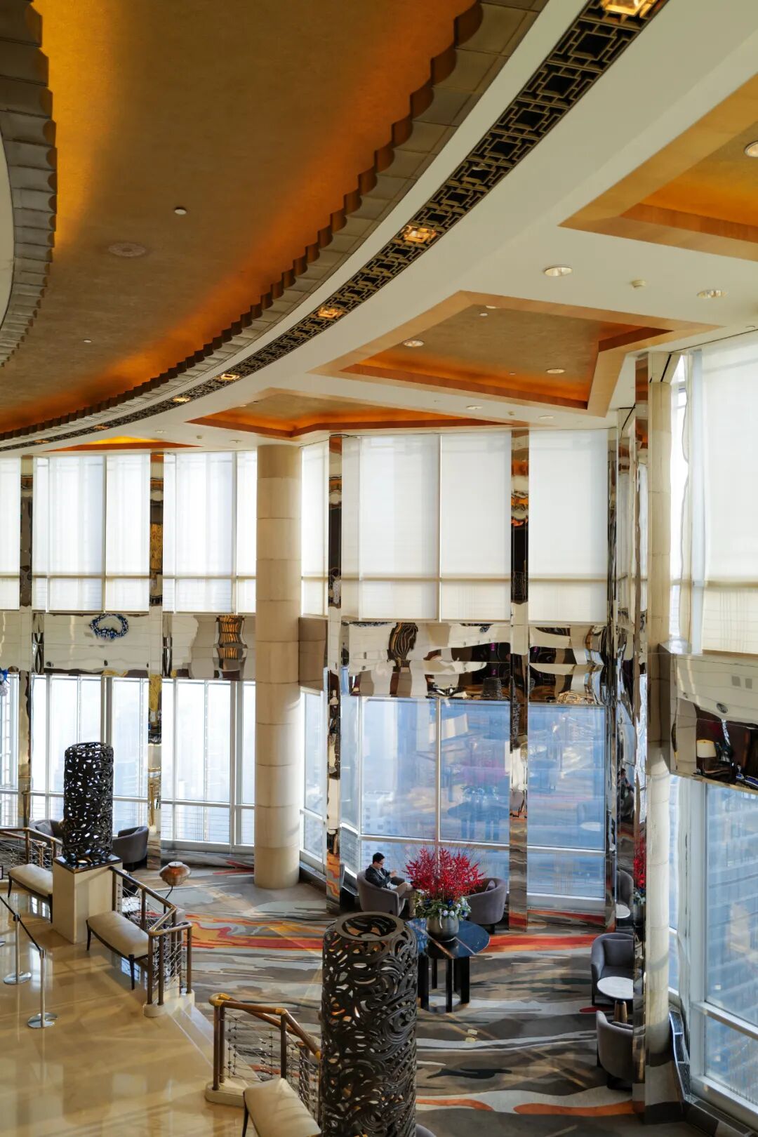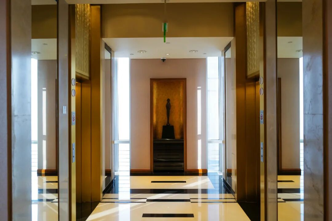 乘高速电梯升至上海最早的高空大堂后,引我叹服的不是开阔的上海城景,而是历经20年时光洗刷,依旧雍容闪耀的金箔电梯门和金箔墙壁,历久弥新、金而不俗腻。