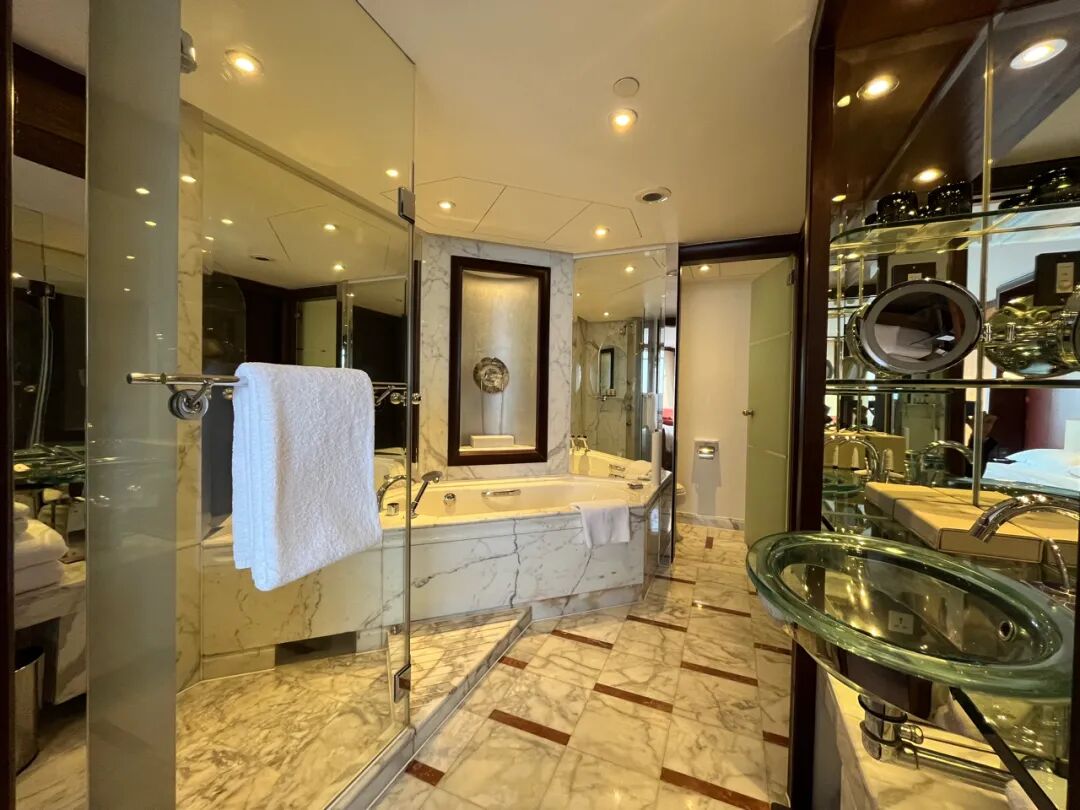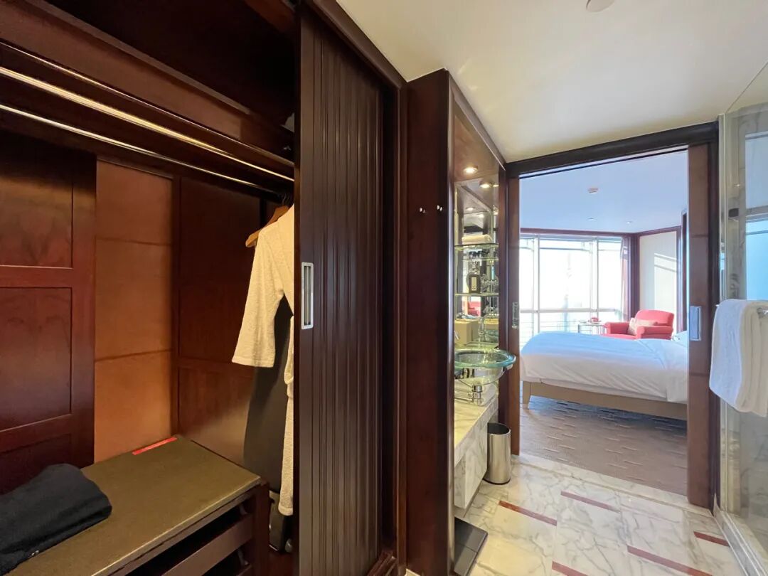金茂君悦客房的浴室也是千禧年前后的空前潮物,玻璃盥洗台盆、若即若离的坐浴和淋浴设施(浴缸和淋浴间共享的三角形台阶设计、借弧边致敬Art Deco风格的玻璃淋浴间门,都太太太高明了!)、可从浴室和入口玄关走廊双向开启的衣柜,至今仍运作流畅、创意和匠艺皆叫人叹服。