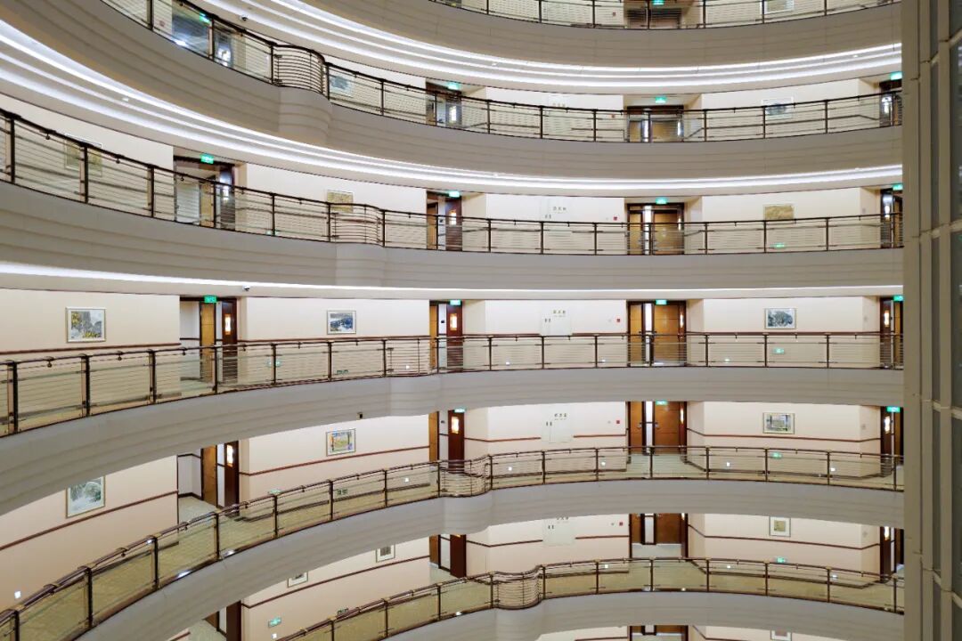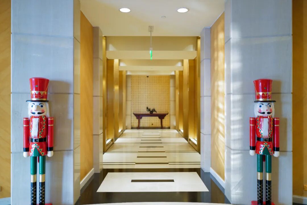 贯穿两层的空中大堂可以把前台接待区和靠窗的休息区以错层格局错开,体现了空间的层次感,也让空中大堂内圈外圈都能更好地欣赏窗外景致。特别想夸赞厅堂内革新演绎的Art Deco(致敬上世纪20、30年代最风行的风格),前台背后通往员工后场的铁艺小门格外入(老上海)戏,柜台上为迎合疫情后时代所安装的透明亚克力窗罩,平衡了安全感和质感。