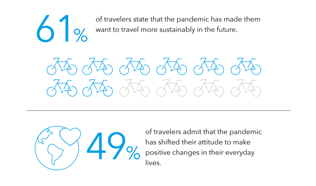 *根据Booking.com缤客对全球30个国家2.9万旅行者的采访总结的《2021可持续旅游发展报告》中的数据显示,61%的旅行者在疫情的影响下越来越重视可持续旅行(Sustainable travel)