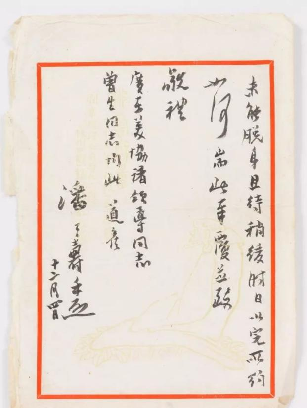潘天寿游广东,意犹未尽,广东美协也非常希望他再次来广东。潘天寿想等过一段时间再来,在信里,潘天寿说:“上次南行,以时间匆促,仅窥一斑,未见全貌,原有重游之想。兹承曾生同志与你会盛情相邀,无任欣幸。顾寿目前以作画及屑务稍多,一时未能脱身,且待稍缓时日,以完所约如何?”可惜潘天寿再没有机会来广东了。