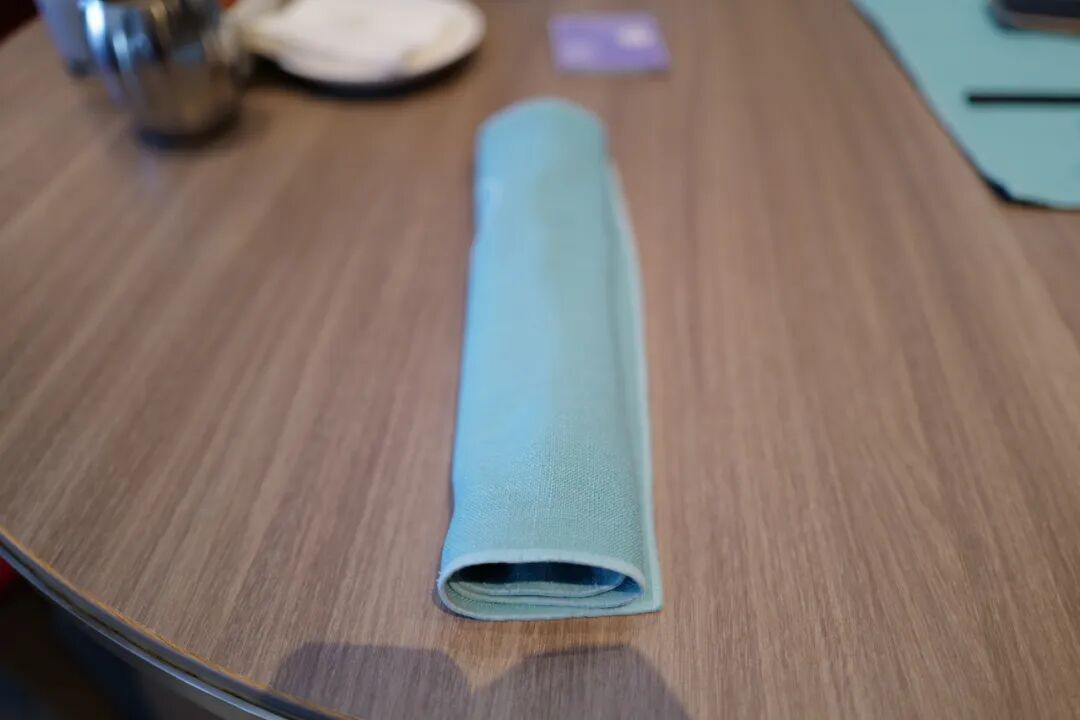 酒店的餐垫内置了收放餐具的内袋,在宾客使用前会悉心卷起放在桌面,待宾客自行展开启用餐垫使命,在Covid-19后时代着实是缜密周全的笔触兼创意。