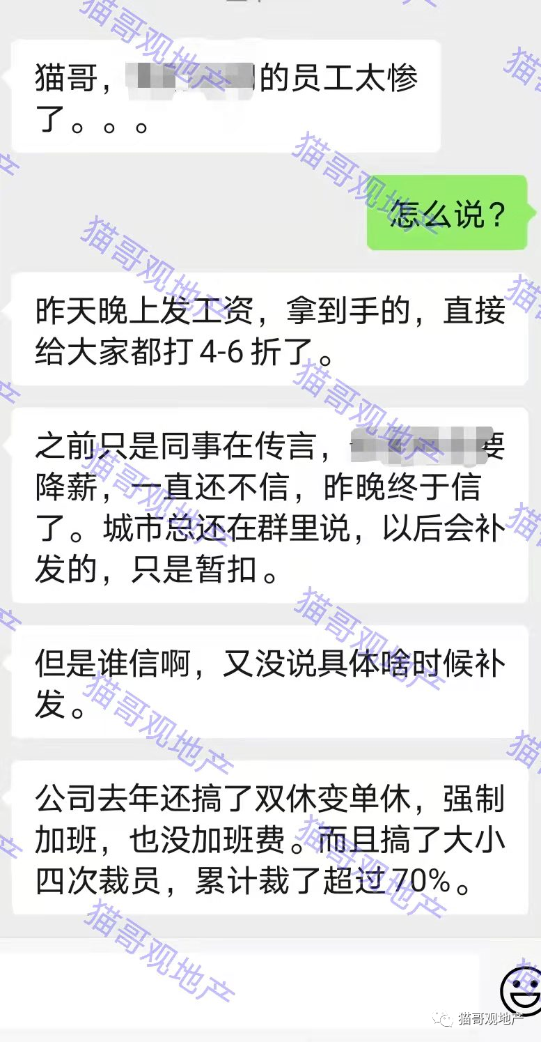 有一家华东房企(后台回复:打折,获知名字提示)的员工,前天晚上收到工资的时候,集体惊呆了。因为之前公司内部一直有传言,全体员工会降薪,按原来的薪酬4-6成发放。公司也一直没发文,只是内部传得有模有样的,前天发工资的时候,大家终于相信了。