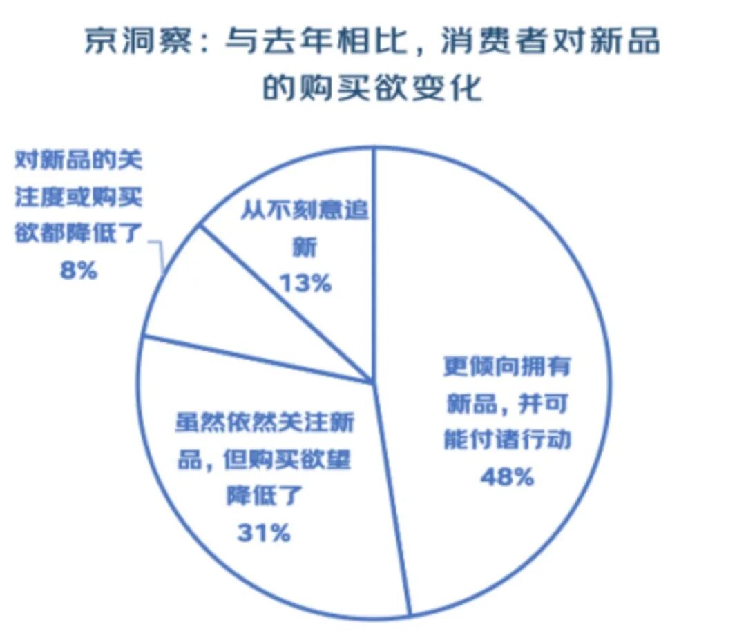 据调研显示,今年消费者购买新品意愿提升的人数占比超过意愿下降者。
